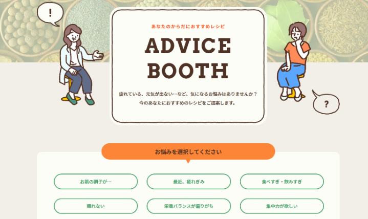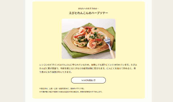 お悩みを選択するだけで、今のあなたにぴったりのレシピをご提案します。疲れている、元気が出ないといった気になるからだのお悩みがある方や、健康的な食生活を送りたい方におすすめです。