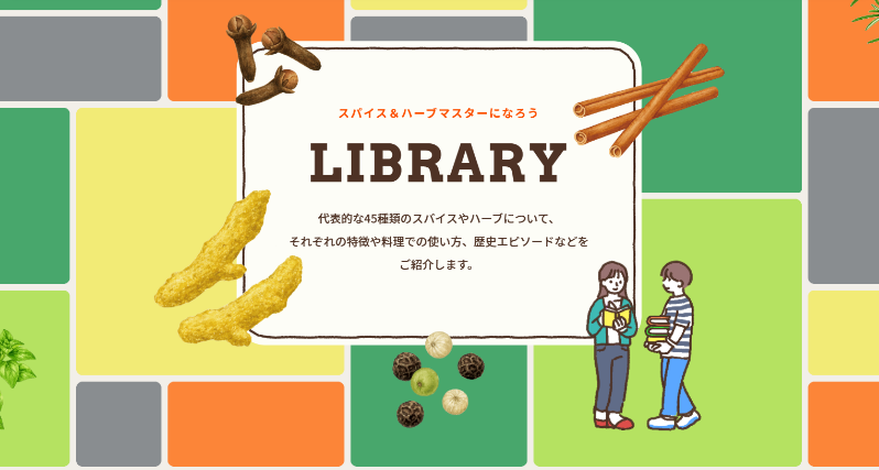 スパイスとハーブの基本の使い方や、料理への活用のコツを知ることができます。スパイスやハーブをどのように使ったら良いのか分からないという方にも、気軽にお試しいただける「ちょい足し術」などもご紹介しています。楽しみながら学べるクイズもあり、親子でお楽しみいただけます。