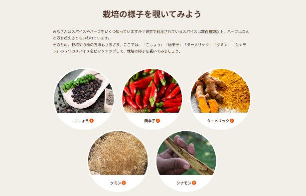 スパイスやハーブがどんな場所で、どのように育っているかを見ることができます。また、持続可能な調達のための取組みなどもご紹介しています。世界の産地の様子を覗いてみたい方、植物の栽培に興味がある方におすすめです。