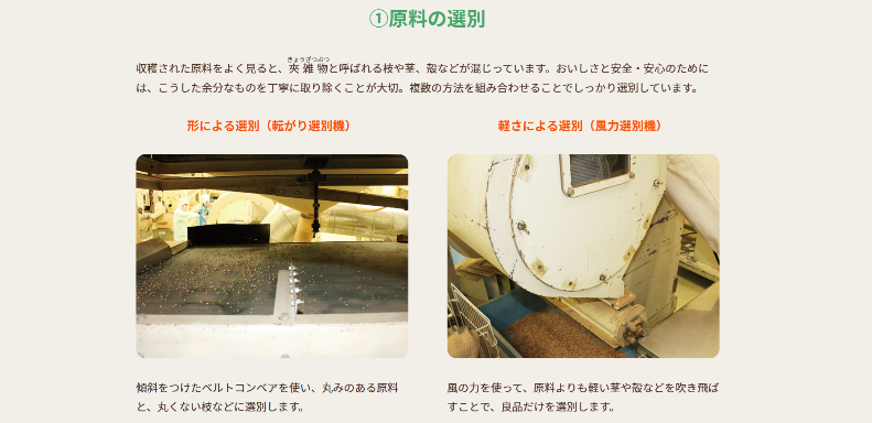 原料から製品になるまでの流れを見ることができます。形や重さ、色の違いを識別するさまざまな選別方法についてもご紹介しています。工場見学に興味のあるお子さまにもおすすめです。