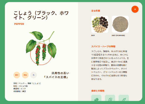 代表的な45種類のスパイスやハーブについて、それぞれの特徴や使い方、歴史エピソードなどを知ることができます。「原産地」や「料理へのはたらき」など、さまざまなカテゴリーでの検索も可能です。一つひとつのスパイスやハーブを、より詳しく知りたい方におすすめです。