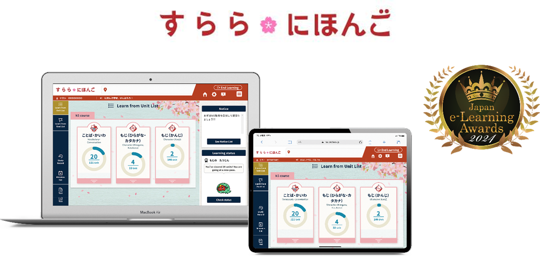 「すらら にほんご」は、国内外の外国にルーツを持つ人々が、就労・留学・日常生活に必要な日本語を、楽しく・無理なく習得できるICT教材です。学習者のレベルに応じて、基礎から応用まで段階的に学べる構成となっており、書写機能を使って文字を書く練習も可能です。
