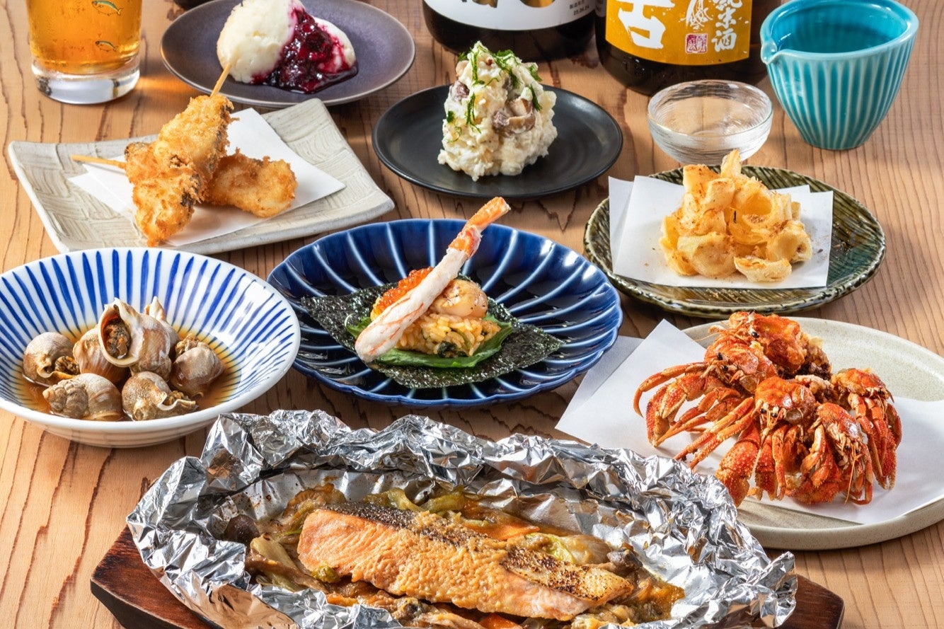このほか、エゾバイ貝の甘煮(650円)や、ゆり根のバラ天(590円)、海と大地のポテサラ(650円)、デザートには北海道産のハスカップを使った北海道牛乳アイス ハスカップベリーソース(490円)など、北海道の大自然の栄養をたっぷり受けて育った海と山の恵みをご用意しています。