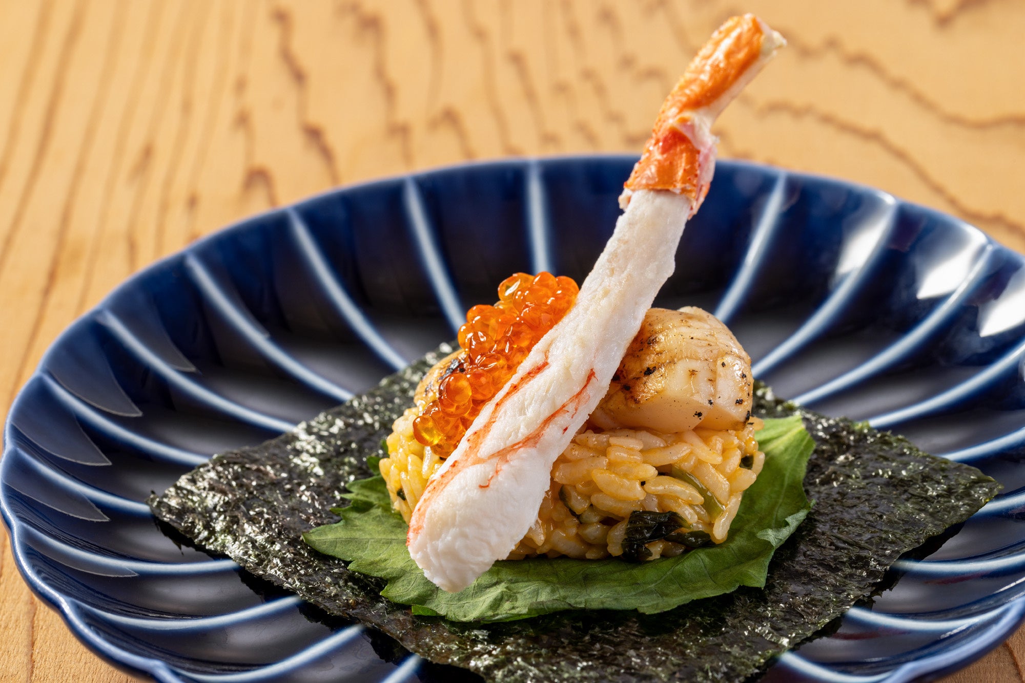 卵黄入りの特製シャリに北海道産の大ズワイガニを大胆に使い、炙りホタテ、いくらを添えた豪快な乗せ寿司は、あて巻きにも、〆の一口にもおススメです。