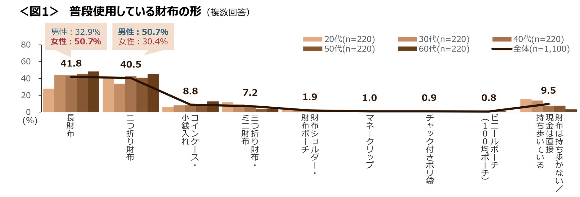 男性は「二つ折り財布」、女性は「長財布」を半数が使用。年代が若くなるにつれて「財布を持ち歩かない」が高い。<図1>