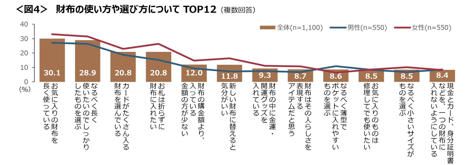 財布の使い方や選び方は、「お気に入りを長く使用」「なるべく長く使いたいのでしっかりしたものを選ぶ」がTOP2で、長く使うことを重視する傾向がうかがえる。