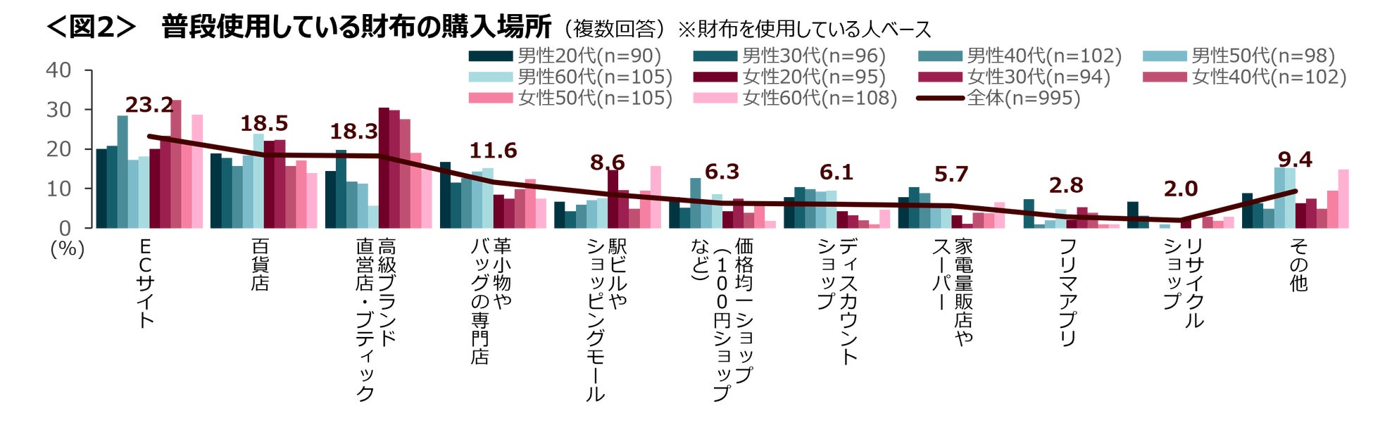 財布の購入場所は「ECサイト」が最も高く、「百貨店」「高級ブランド直営店・ブティック」が続く。