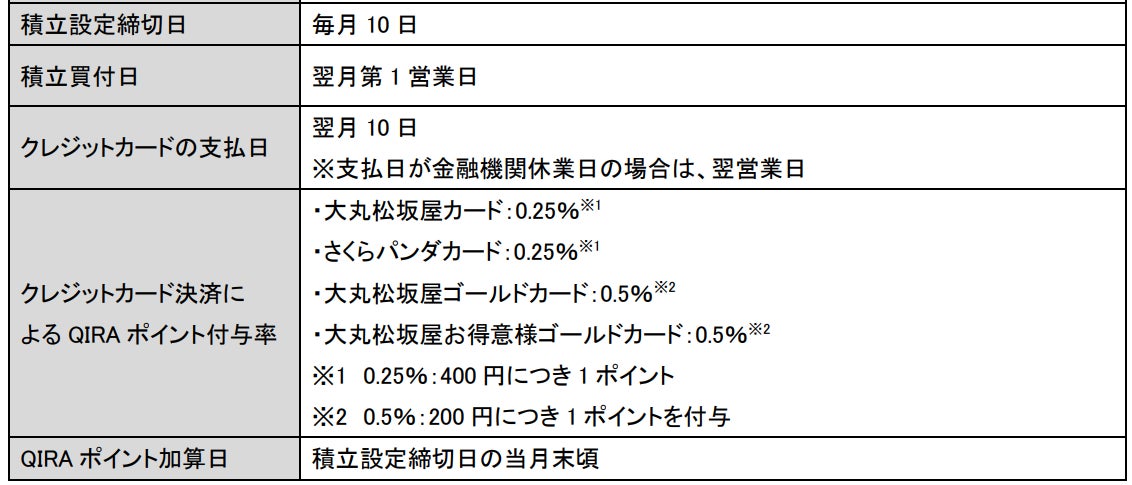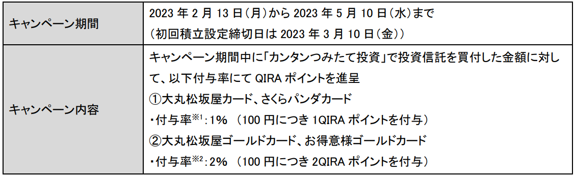 また、サービスの開始を記念して、大丸松坂屋カードによる投資信託の購入金額に対して付与されるQIRA[キラ]ポイントの付与率を、1%または2%(通常は0.25%または0.5%)にアップするスタートダッシュキャンペーンを実施します。