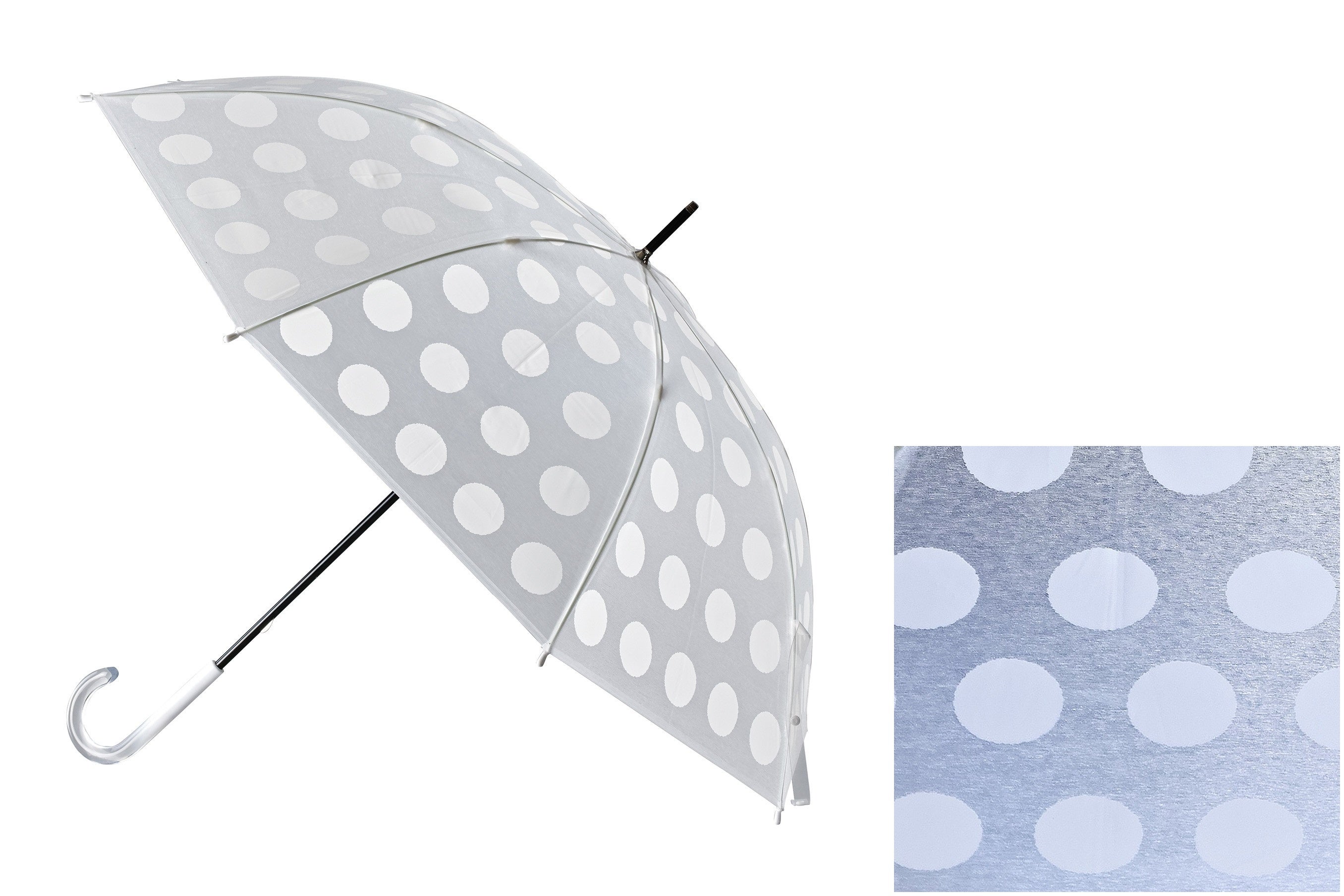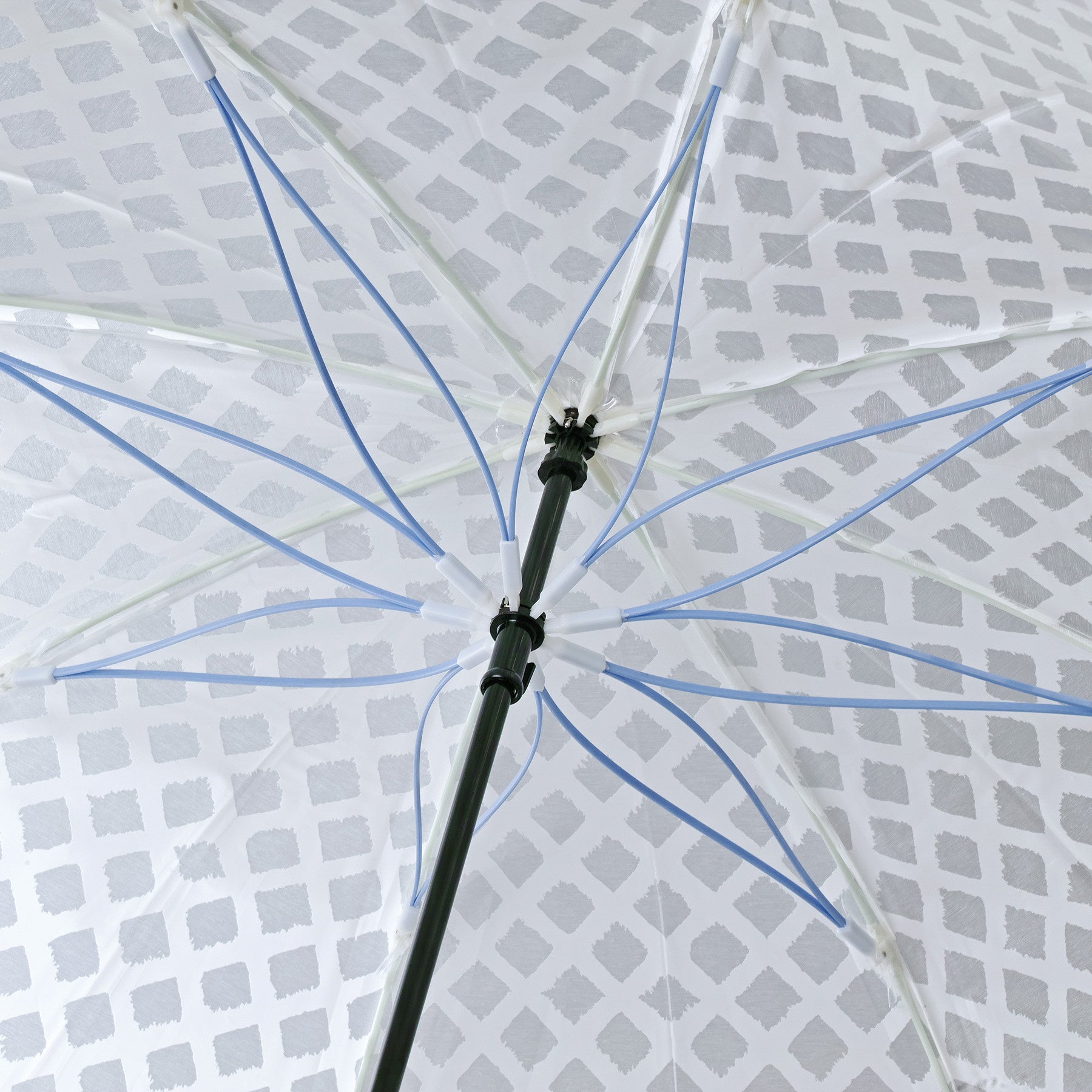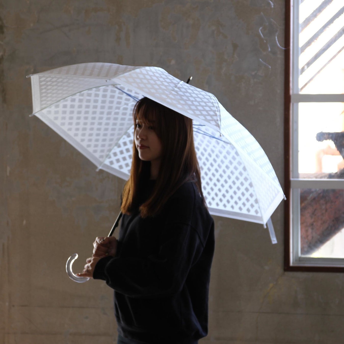 特殊な表面のテクスチャーに、まるで透かし和紙のようなデザインの「ハッピーフロストアンブレラ」は、透明傘に抵抗感がある方や落ち着いたデザインを探されている方におすすめしたい大人のためのビニール傘です。フロストタイプの半透明素材は角度によってキラキラした繊維のように反射し、高級感漂う透かし和紙のような風合いに仕上げました。その上品な質感は一見、ビニール傘とは思えないほどのクオリティーです。さらに、透明~乳白色と目を引くグラデーションのハンドルと、開いた時に広がるブルーのお花をイメージした受骨で女性らしさを演出。柄は和紙の素材感を引き立たせる、水玉・格子・花柄の3柄展開。持つ人を上品に魅せ、傘を開いた時の幻想的な世界は中に居る自分も惚れ惚れする美しさなので雨の日が待ち遠しくなるビニール傘です。普段使いにはもちろん、浴衣や和装など様々なシーンで活躍するアイテムです。