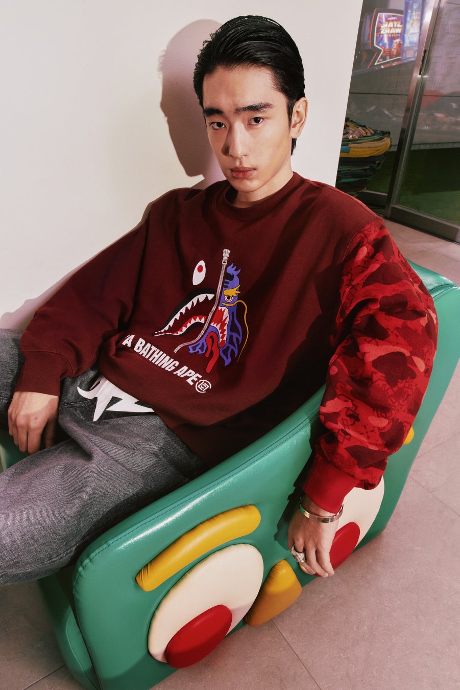 Tシャツは、コラボレーションオリジナルのCAMO柄を全面に配したデザインと、BIG APE HEAD TEEの2型。鮮やかなグラフィックとカラーが特徴で、クラシックなシルエットにユニークなアクセントを加えました。
