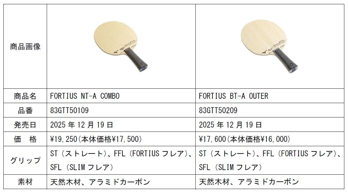 ミズノは、中級者・上級者向け卓球ラケット「FORTIUS NT-A COMBO(フォルティウス エヌティーエー コンボ)」「FORTIUS BT-A OUTER(フォルティウス ビーティーエー アウター)」を12月19日にミズノ直営店、ミズノ品取扱店で発売します。