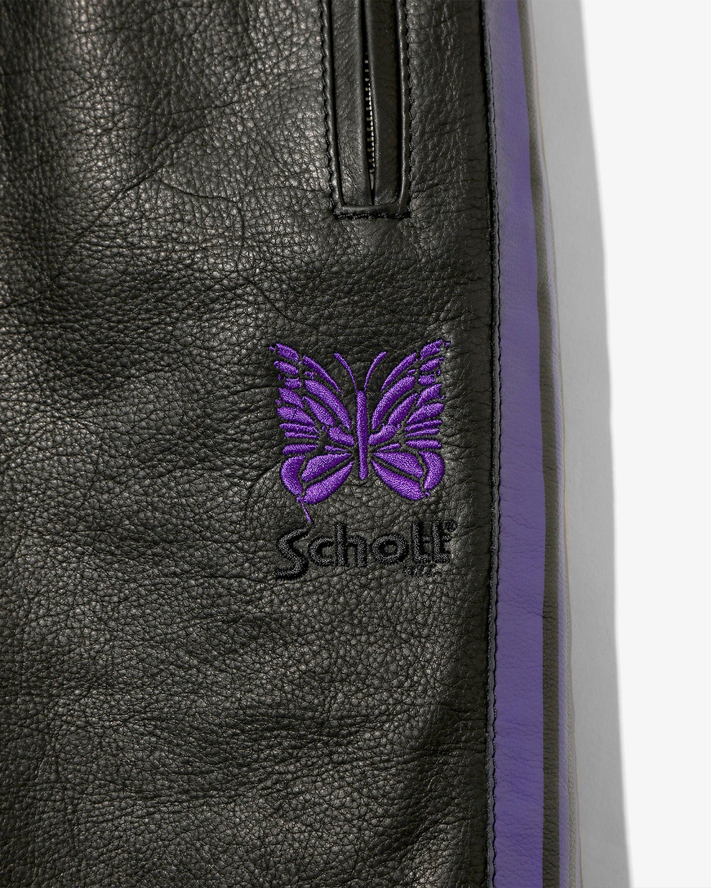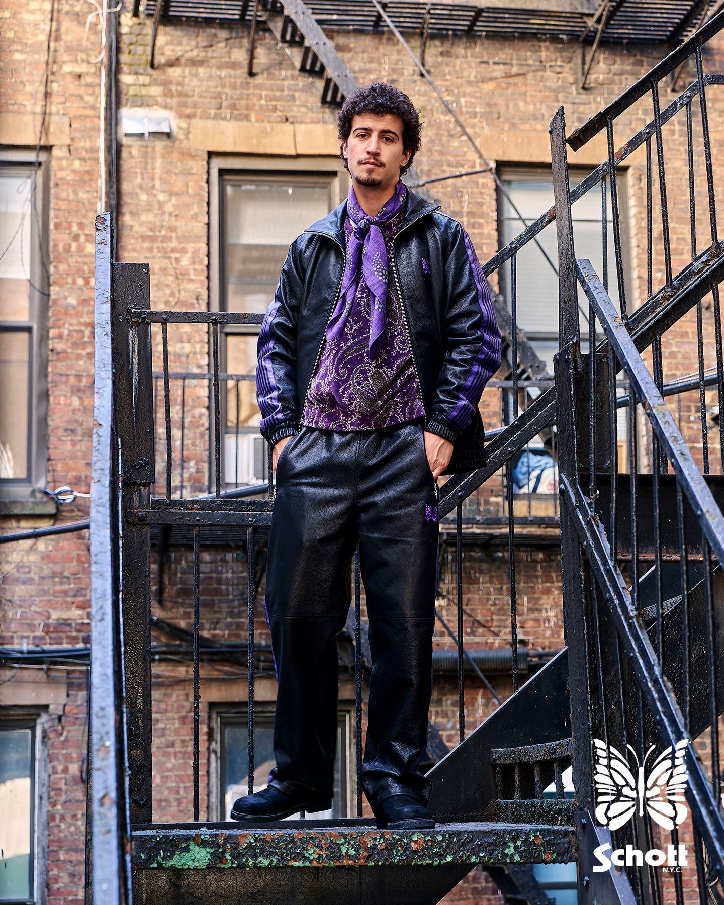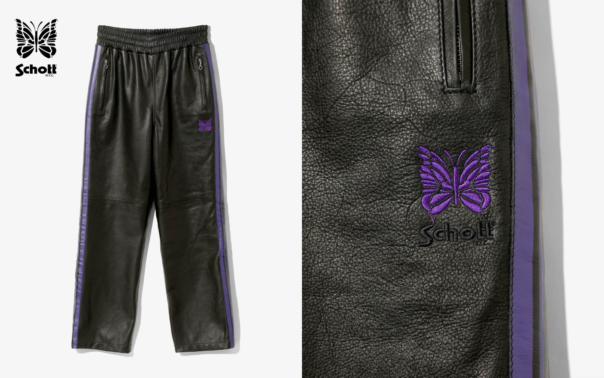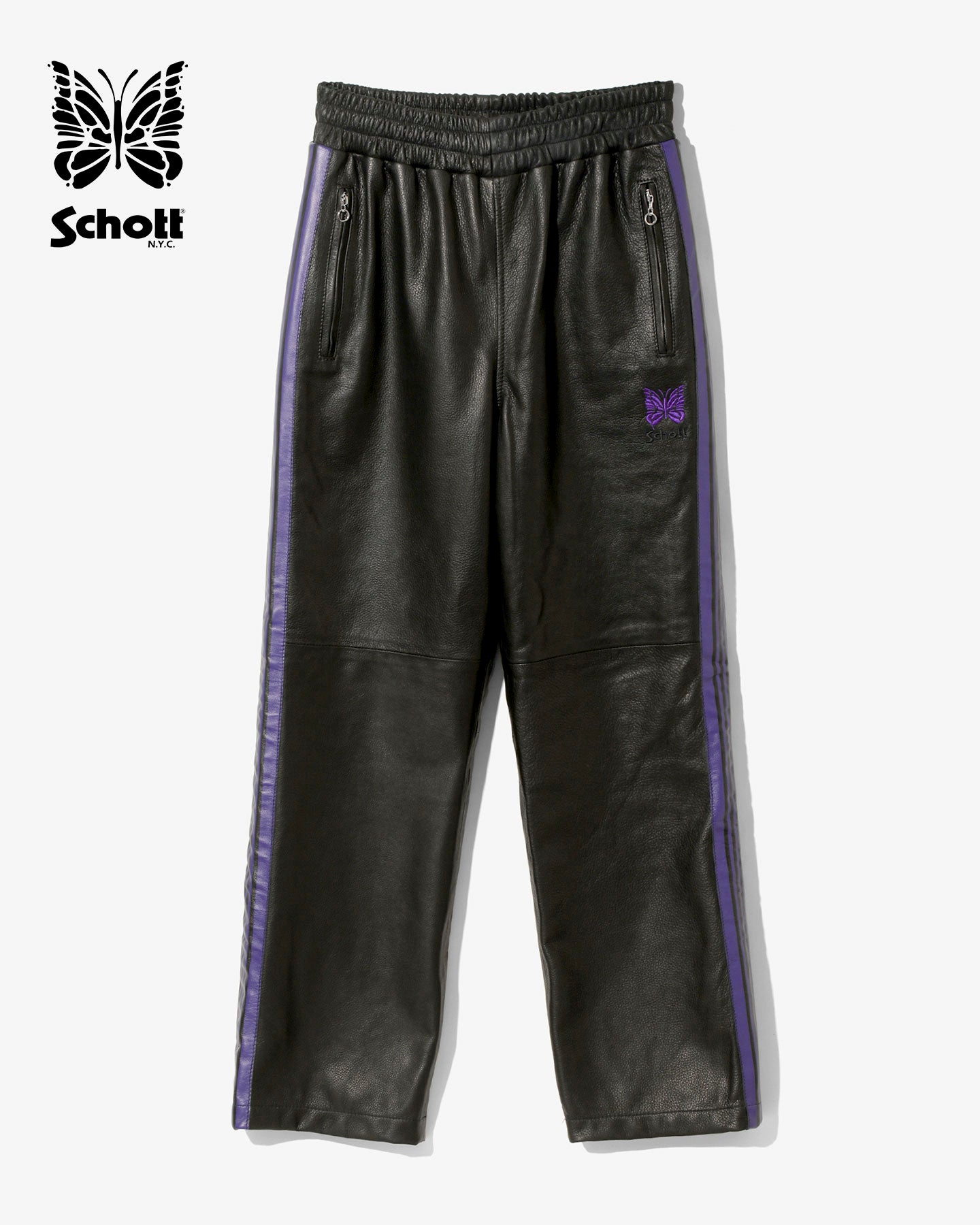 「Schott」ならではの滑らかな質感の力ウハイドを全面に使用し、両ブランドモチーフの刺繍がなされたスペシャル仕様の「TRACK JACKET」と「TRACK PANTS」が登場。