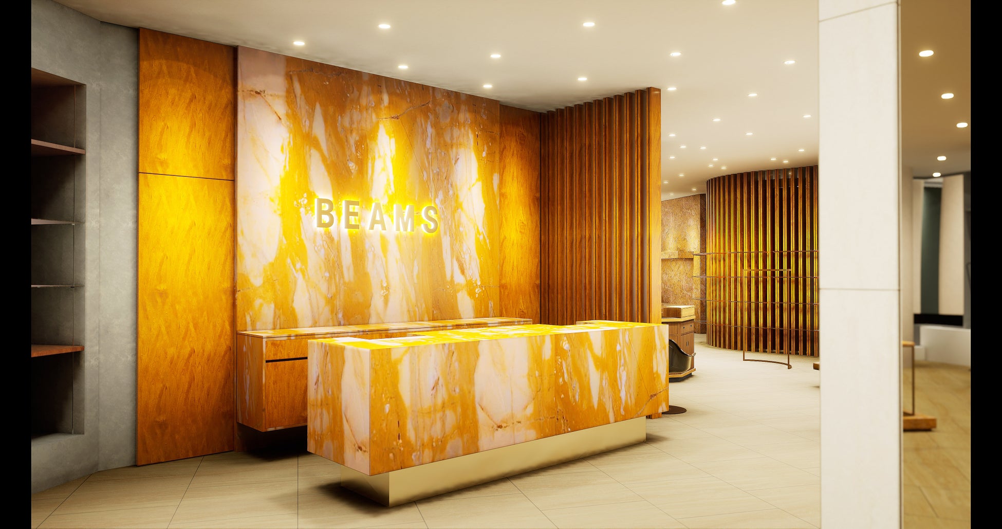 東京・六本木の「六本木ヒルズ」ウェストウォークでリニューアルオープンする「ビームス 六本木ヒルズ」は、メインエントランスのある2階にウィメンズフロア、3階にはオーダーサロンを併設しながらもカジュアルから重衣料までを展開するメンズフロアという2層の構成で、内装面においても、壁面や什器に特徴的なイエローの大理石を使用し、壁に曲線を多用することで、高級感がありながらも柔らかい印象を与える、“The Premium”というショップコンセプトを表現する店舗になりました。