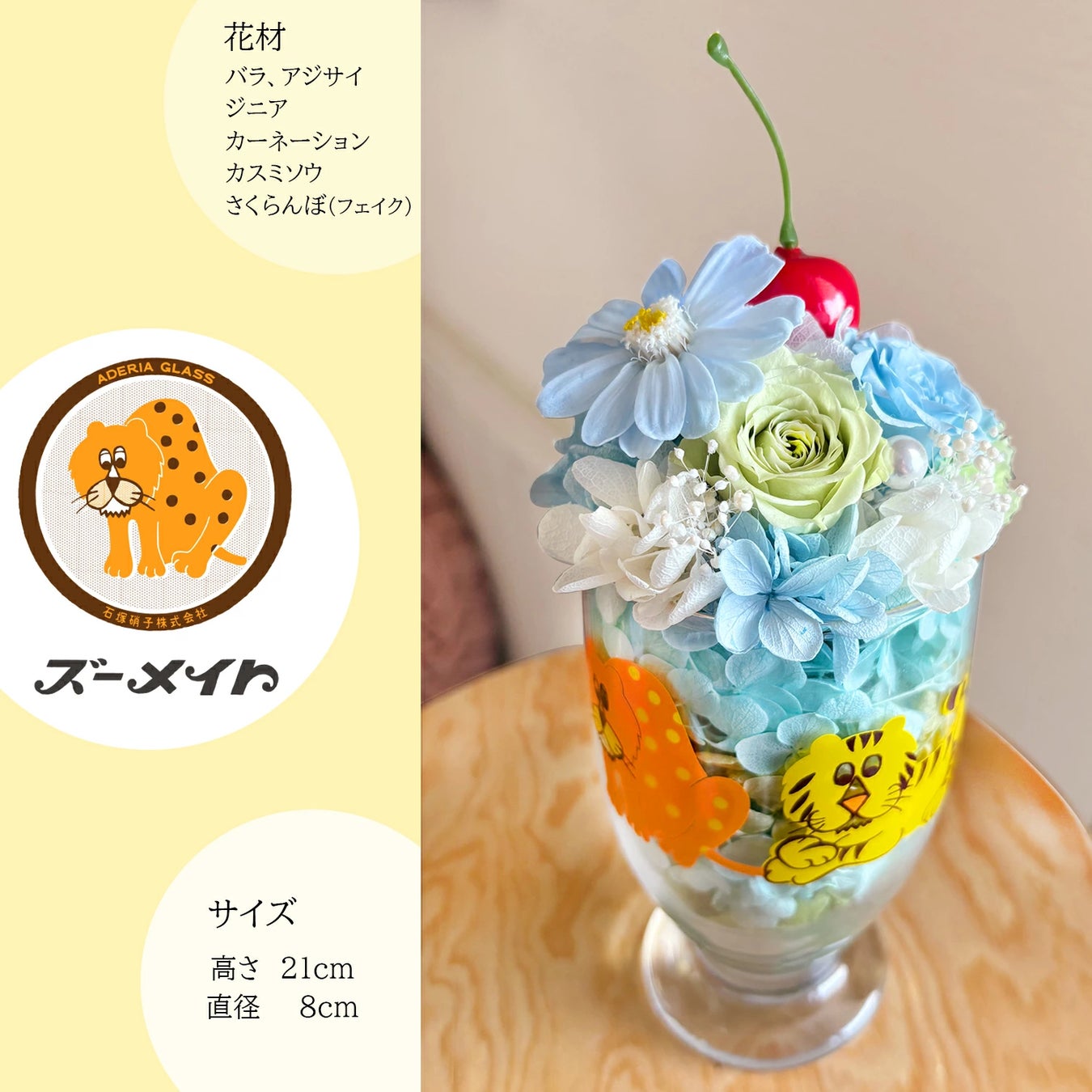 あじさいやバラ、カーネーション、ジニアといった花材でクリームソーダをイメージ。トップにはフェイクのさくらんぼもアクセントに。グラスのデザインは「花まわし」「野ばな」「ズーメイト」から選べます