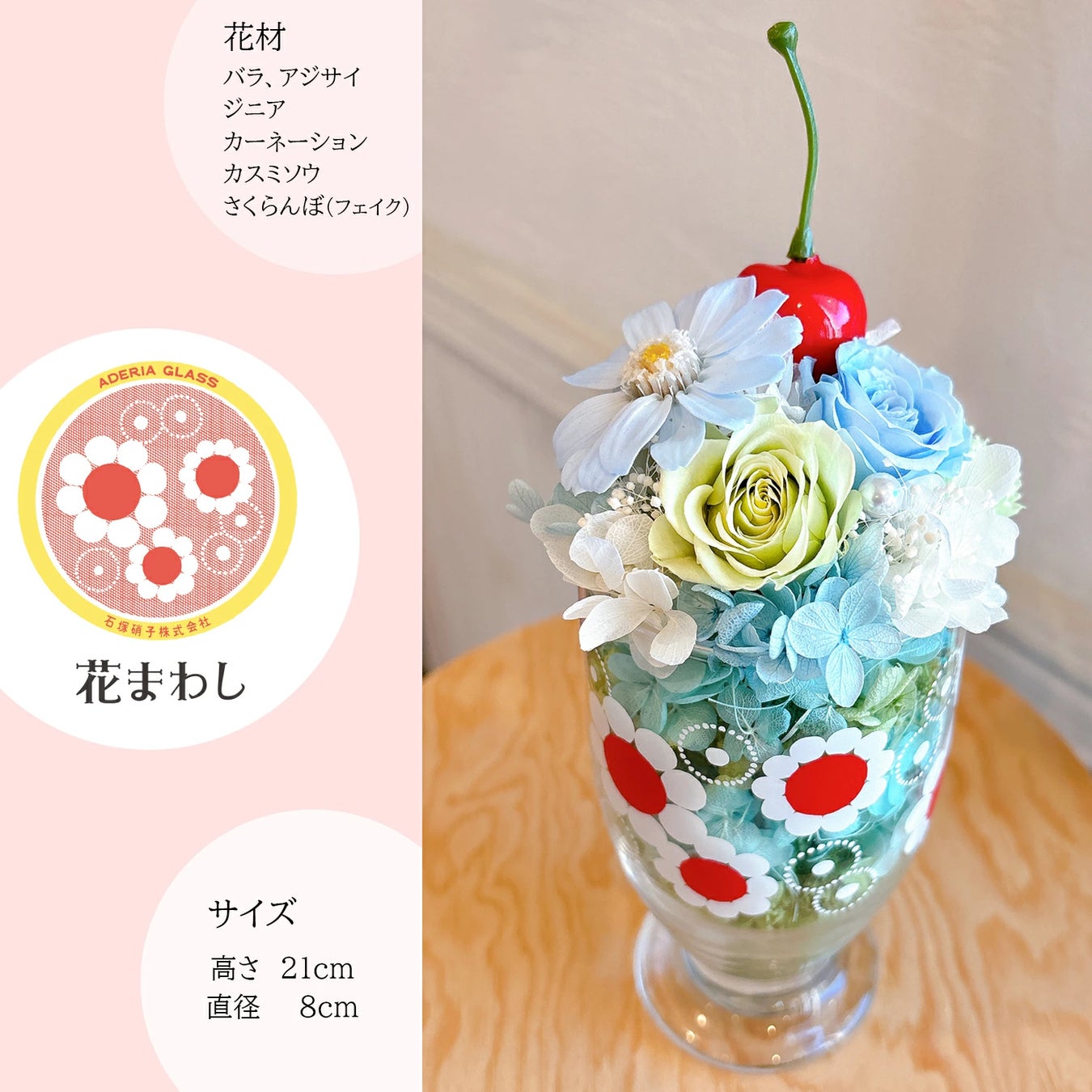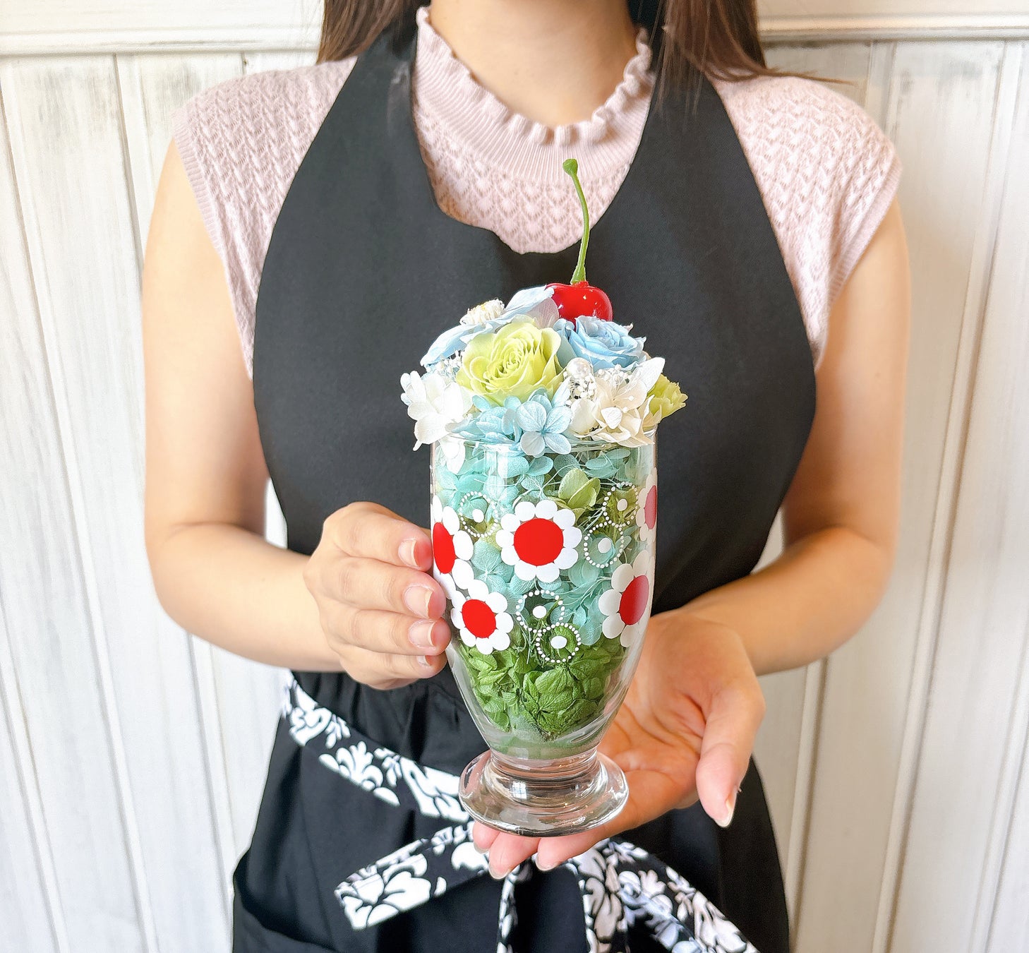 今回マイペリドットから登場したのは、店主も大好きなアデリアレトロのグラスを使用し、喫茶店のクリームソーダをイメージして制作した、ユニークなプリザーブドフラワーアレンジメント。多くのファンを持つアデリアレトロのグラスウェアを、フラワーアレンジメントの花器として使用しています。バラやあじさい、ジニア、カーネーション、カスミソウといったプリザーブドフラワーを使い、ブルーとグリーンの花を基調に、白いお花も使って、メロンソーダとクリームを表現しています。トップには可愛いチェリー(フェイク)もアクセントにあしらっています。