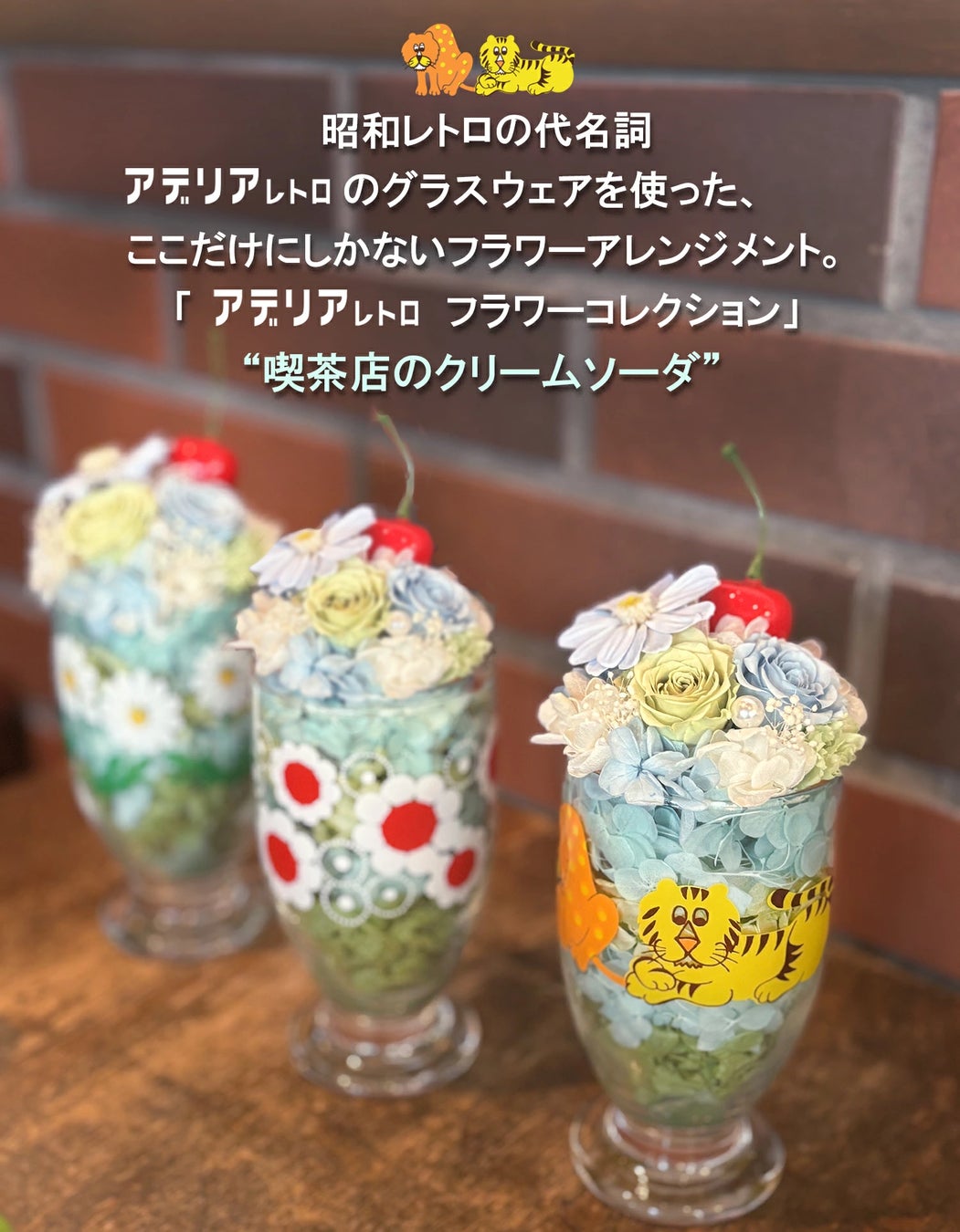 ペットの似顔絵フラワーやキャラクターフラワーを制作するお花屋さん「動物のお花屋さんマイペリドット」を運営する株式会社岡田商会(所在地:大阪府大阪市、店長:小原冬萌)は自社オンラインショップにて、昭和レトロブームの火付け役としてたくさんのファンに愛されている「アデリアレトロ」のグラスウェアを使ったクリームソーダ風フラワーアレンジメント「アデリアレトロ フラワーコレクション『喫茶店のクリームソーダ』」の販売を開始しました。