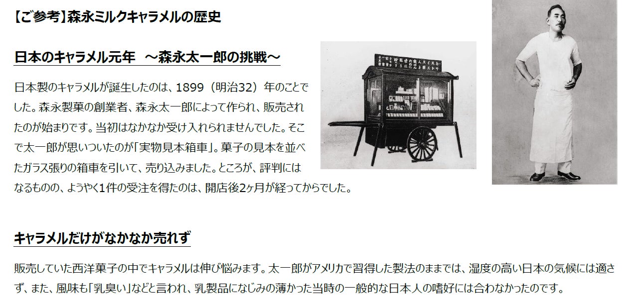 「ミルクキャラメル」は、1913年6月10日に誕生し、6月10日は「ミルクキャラメルの日」として制定されています。パッケージにある「滋養豊富・風味絶佳」という言葉の通り、西洋菓子に馴染みのない時代に、森永製菓の創業者・森永太一郎が「日本の人々に栄養価の高いおいしい西洋菓子を提供したい」という想いを込めて発売した、森永製菓の原点ともいえる商品です。時代を超えてみなさまに愛され続け、112年を迎えます。その感謝の気持ちをこめて、「ミルクキャラメル」のおいしさや100年以上磨き続けた製造技術、歴史を生かした様々な商品を展開することで、お客様に笑顔を届けます。