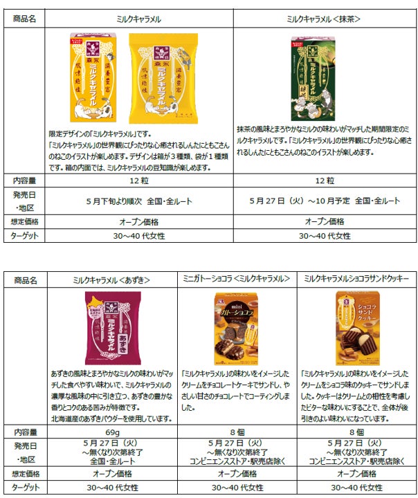 森永製菓株式会社(東京都港区芝浦、代表取締役社長 COO・森 信也)は、6月10日の「ミルクキャラメルの日」を記念した商品を5月27日(火)より発売いたします。抹茶の風味とまろやかなミルクの味わいがマッチした「ミルクキャラメル<抹茶>」、あずきの風味とまろやかなミルクの味わいがマッチした「ミルクキャラメル<あずき>」、ミルクキャラメルとショコラの組み合わせを楽しめる「ミニガトーショコラ<ミルクキャラメル>」と「ミルクキャラメルショコラサンドクッキー」です。また、おなじみの黄色い箱と袋の「ミルクキャラメル」、そして「ミルクキャラメル<抹茶>」は、心癒されるねこのイラストが楽しめる特別なパッケージで発売します。