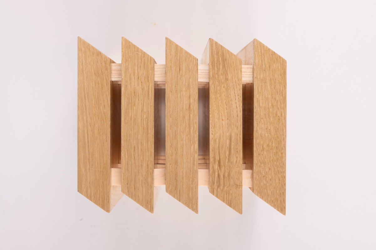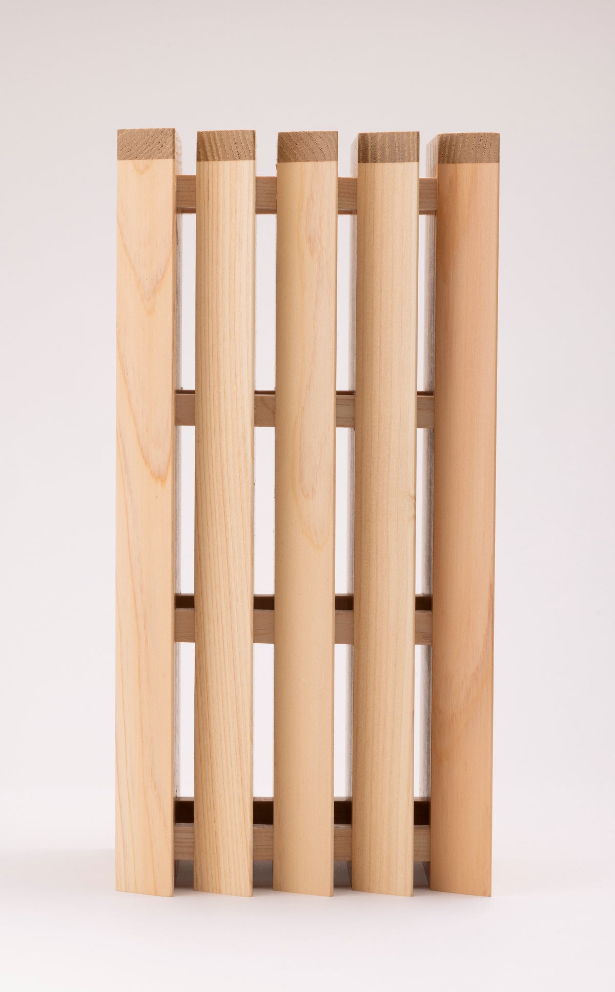 日本の伝統的な建築様式の一つである校倉造(あぜくらづくり)で使用される三角形に加工した角材から着想を得たデザイン。木材を組み合わせて使用することで、通気性が確保でき、衛生的です。