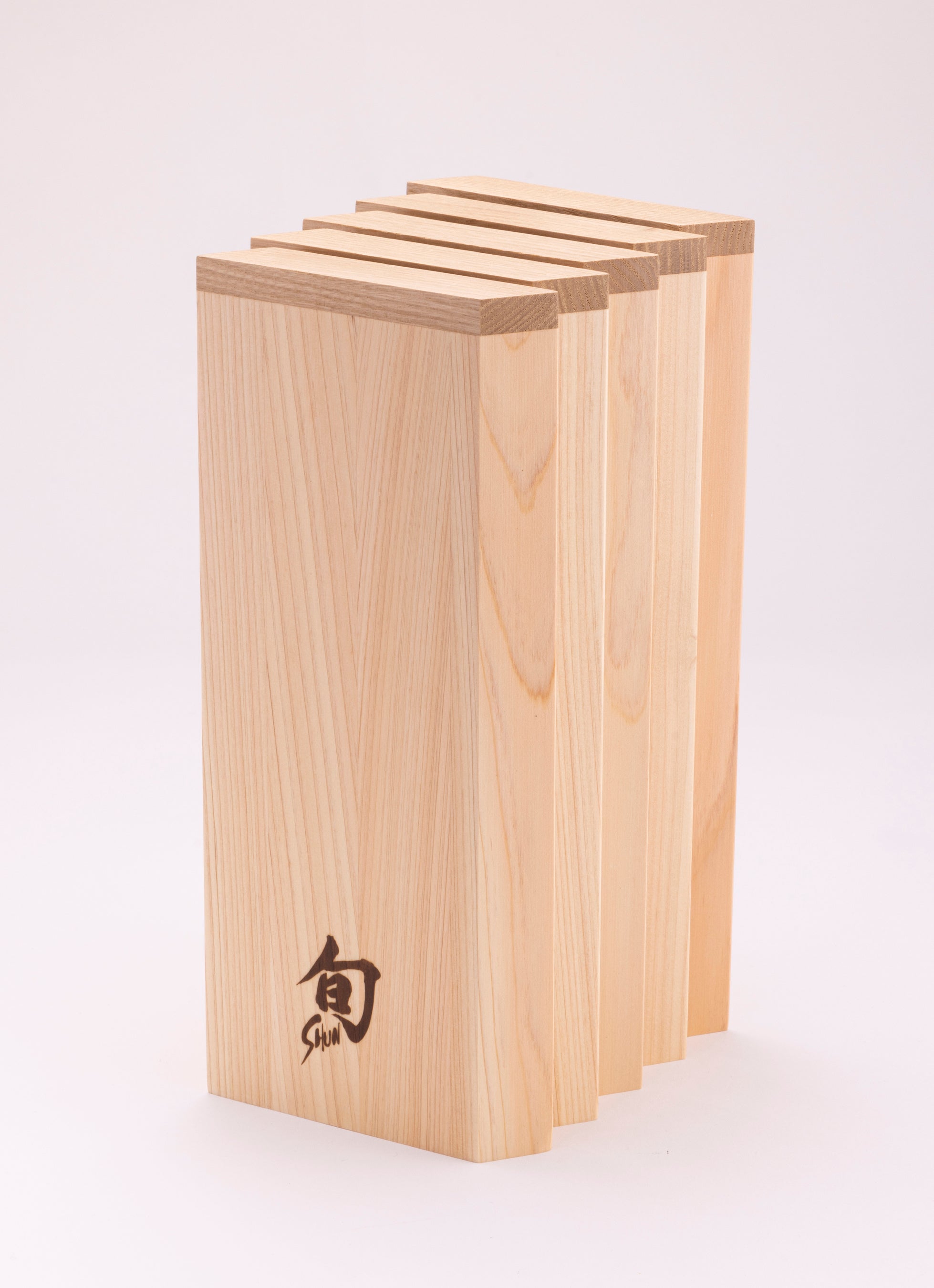 旬の切れ味を彷彿とさせるシャープな印象を与えつつ、ひのきをメインに使うことで、どこか上品な印象を与えます。包丁の差込口にはひのきよりも硬い楢(なら)を使用することで、包丁がナイフブロックに当たっても傷つきにくいです。最大4丁保管できる実用性も兼ね備えています。