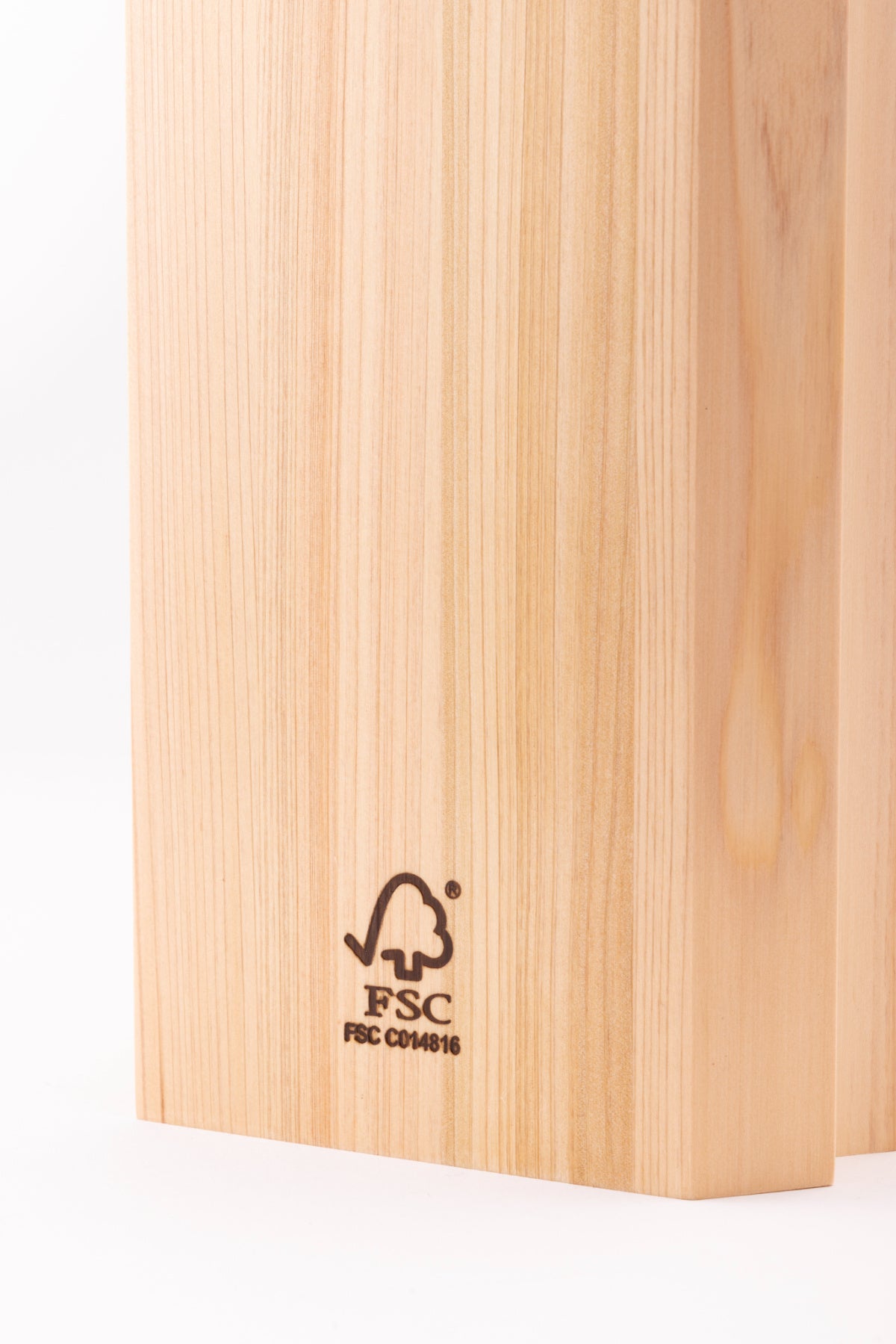 環境や地域社会に配慮して適切に管理された森林から生産された木材にのみ与えられるFSC認証。本製品はどちらもFSC認証を受けた国産ひのき材を使用しています。