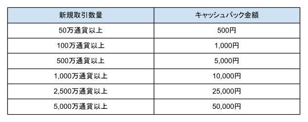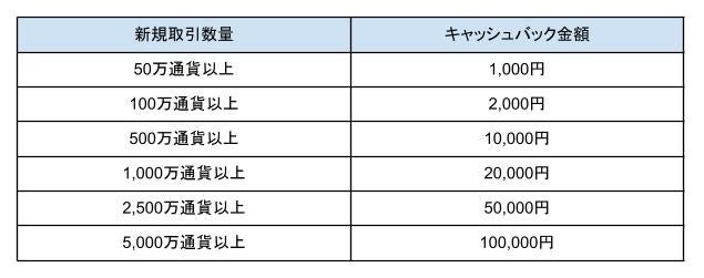 「選べる外貨」の全通貨ペアを対象に、期間中の新規取引数量に応じてキャッシュバックします。