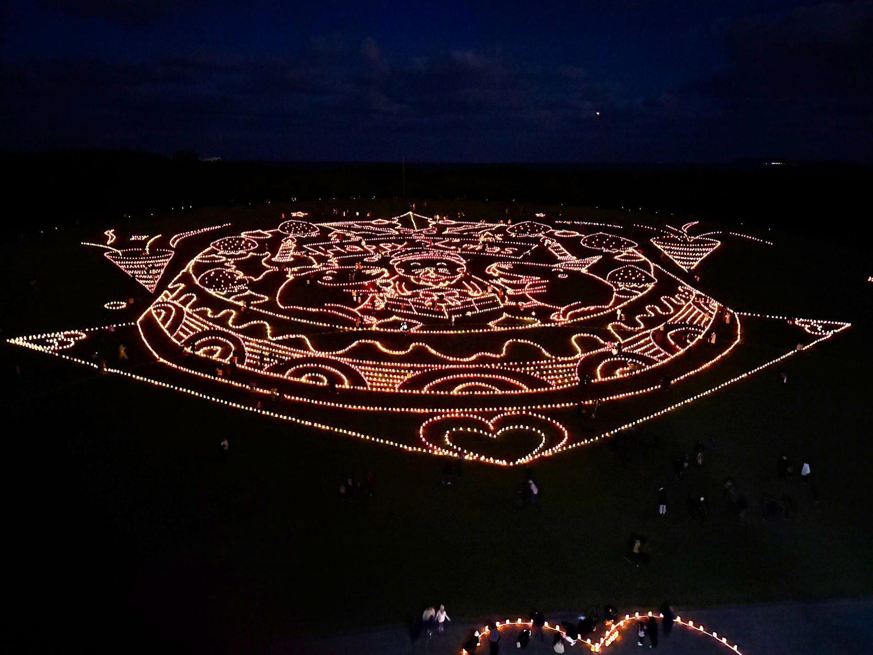 1万本のキャンドルからなる光の地上絵を灯し、ロマンチックな空間を演出します。地上絵は上空から撮影し会場モニターで流すため全体像もご覧いただけます。