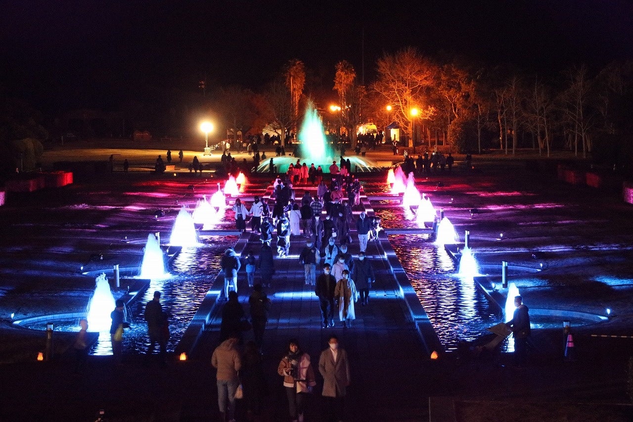 西口から伸びる全長100mのカナールをライトアップ。噴水をキャンドルに見立てた演出が幻想的です。今年は音楽も加わり、音と光の饗宴を楽しめます。
