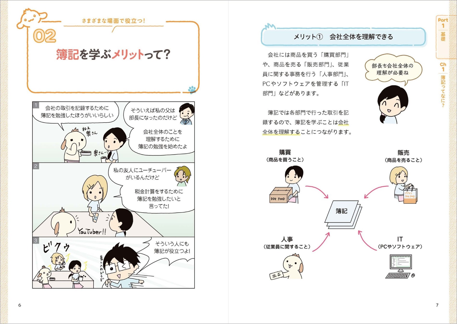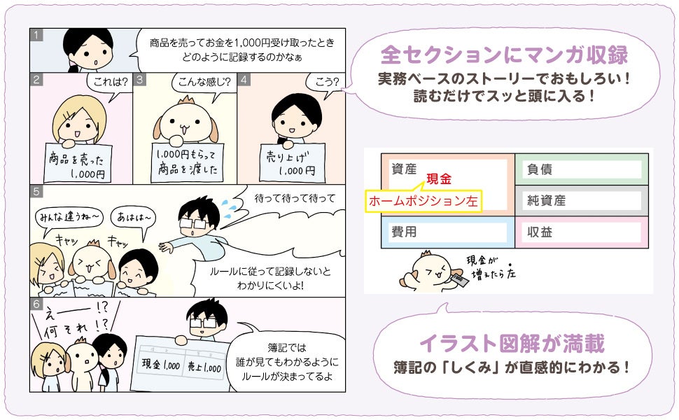 犬のパブロフくんと一緒に会社の取引を記録していくマンガとストーリーで、簿記や会計の基本的な考え方やお金の流れが自然と頭に入ります。専門用語や細かいルールは最小限に抑え、フルカラーのイラストを豊富に使うことで、簿記の構造や使われ方、会計の考え方などをイメージできるように解説します。