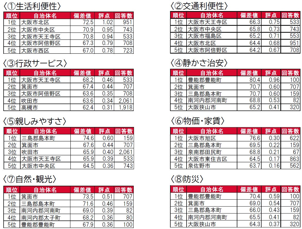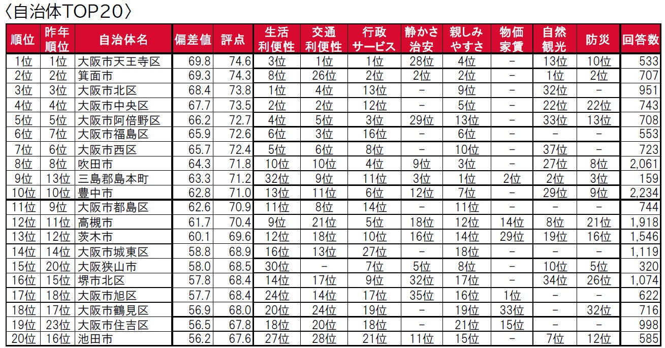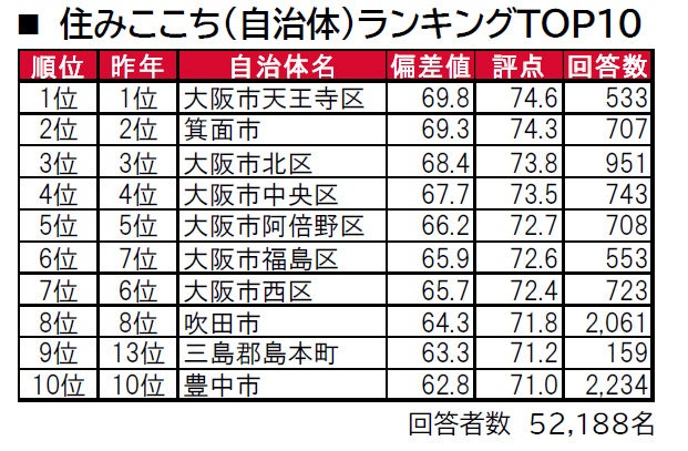 1位は4年連続で大阪市天王寺区、2位は3年連続で箕面市、3位は4年連続で大阪市北区で、トップ3は安定した評価を得ています。9位には、大阪市や京都市のベッドタウンとして住宅地開発が進む三島郡島本町(昨年 13位)がランクインしています。