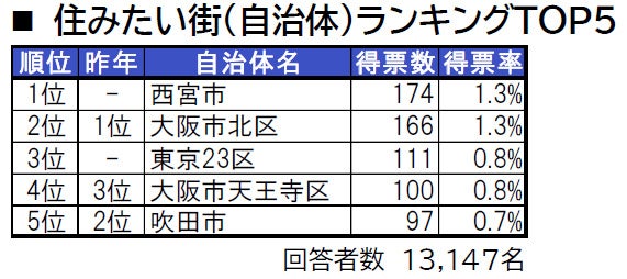 昨年は大阪府の自治体のみを対象として集計していましたが、今年は全国の自治体を対象とした結果、1位に兵庫県西宮市、3位には東京23区がランクインする結果となっています。昨年1位の大阪市北区は、今年は2位です。