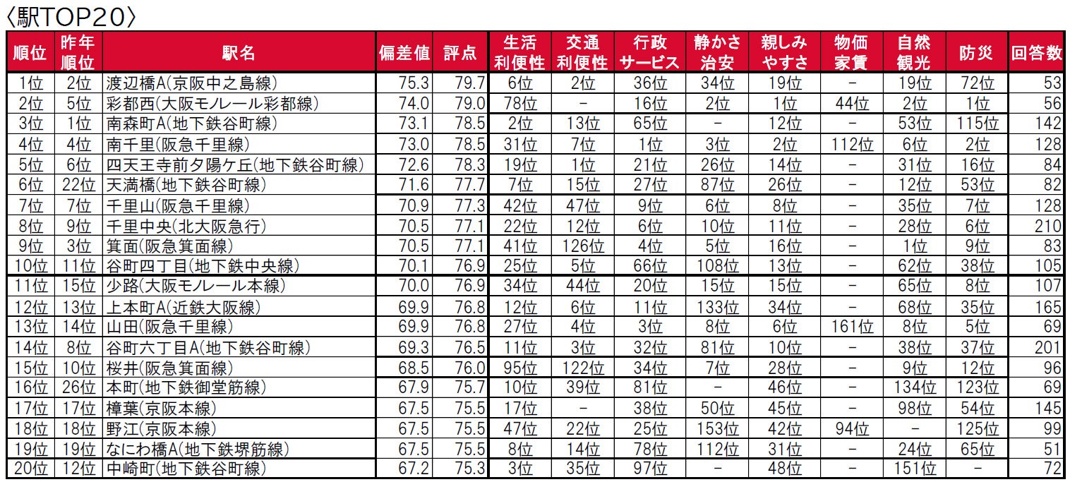 1位は、駅周辺に超高層ビルが林立している渡辺橋Aです。2位は彩都西で、彩都線の終着駅で電柱のない整備された街並みのニュータウンです。3位は、昨年は1位の南森町Aです。6位は天満橋で、昨年22位から大幅に順位を上げています。1位~11位までの駅は偏差値70台の極めて高い評価を得ています。