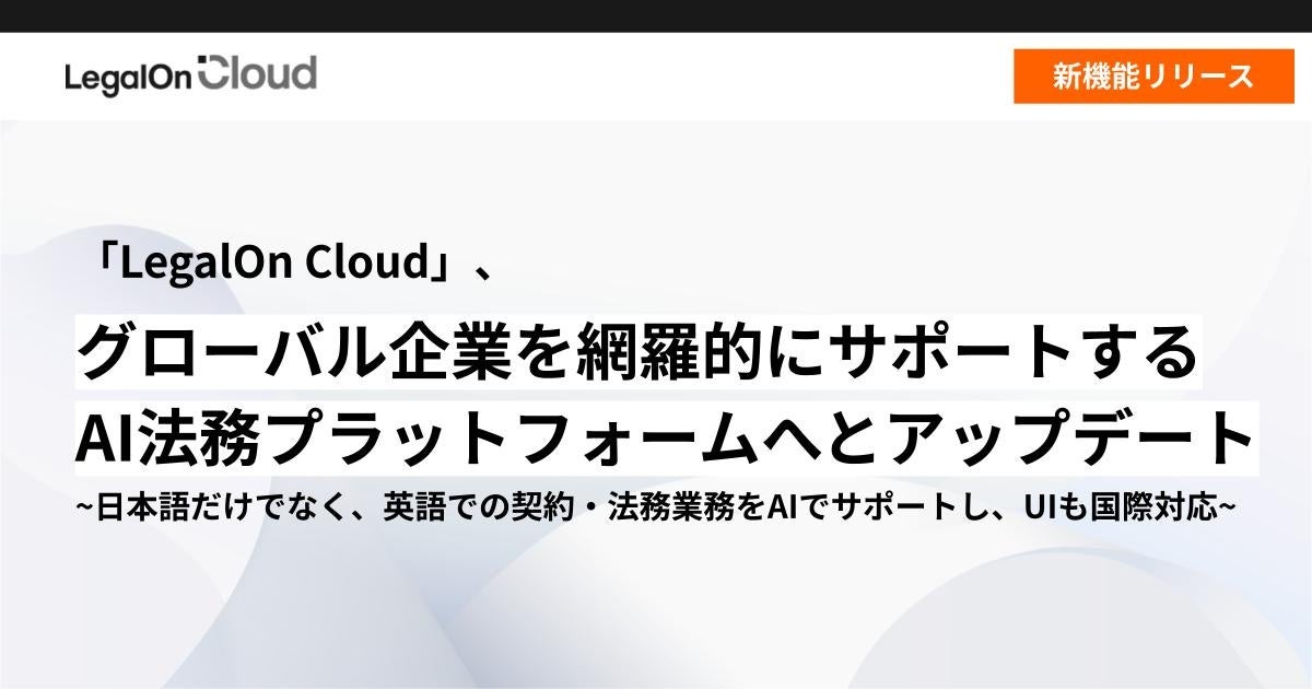 株式会社LegalOn Technologies(本社:東京都渋谷区 代表取締役 執行役員・CEO:角田望、以下LegalOn Technologies)が提供する、「LegalOn Cloud」( https://www.legalon-cloud.com/)は、グローバル企業を網羅的にサポートするAI法務プラットフォームへとアップデートします。日本語だけでなく、英語での契約・法務業務をAIでサポートし、UIの国際対応を行います。