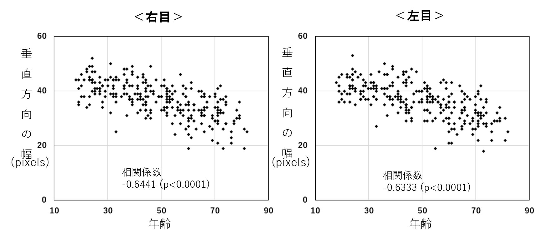 散布図は、年齢に応じた縦方向の目の幅の分布を示す。