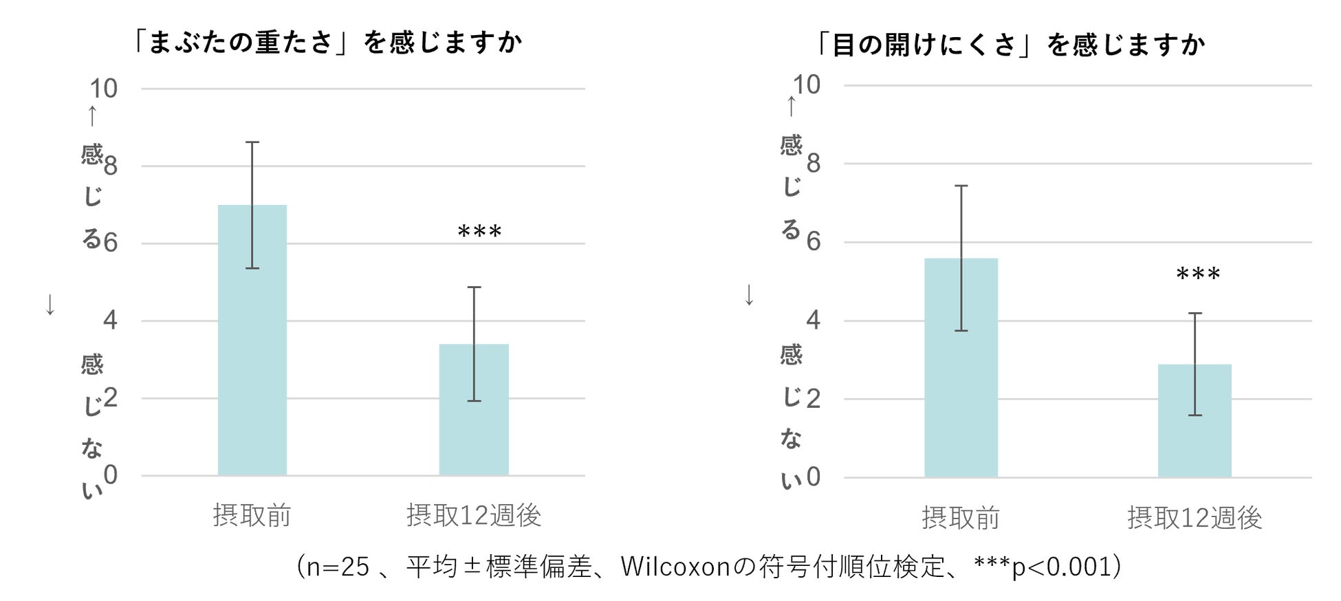 25名(24~65歳、平均年齢41.64±12.33歳、女性23名、男性2名)の被験者にマキベリーエキス、カシスエキスを配合したサプリメントを12週摂取してもらう試験を実施しました。摂取前と摂取後に、 実感アンケートを実施したところ、摂取によりまぶたの重たさや目の開けにくさに関する自覚項目を改善する結果が得られました。