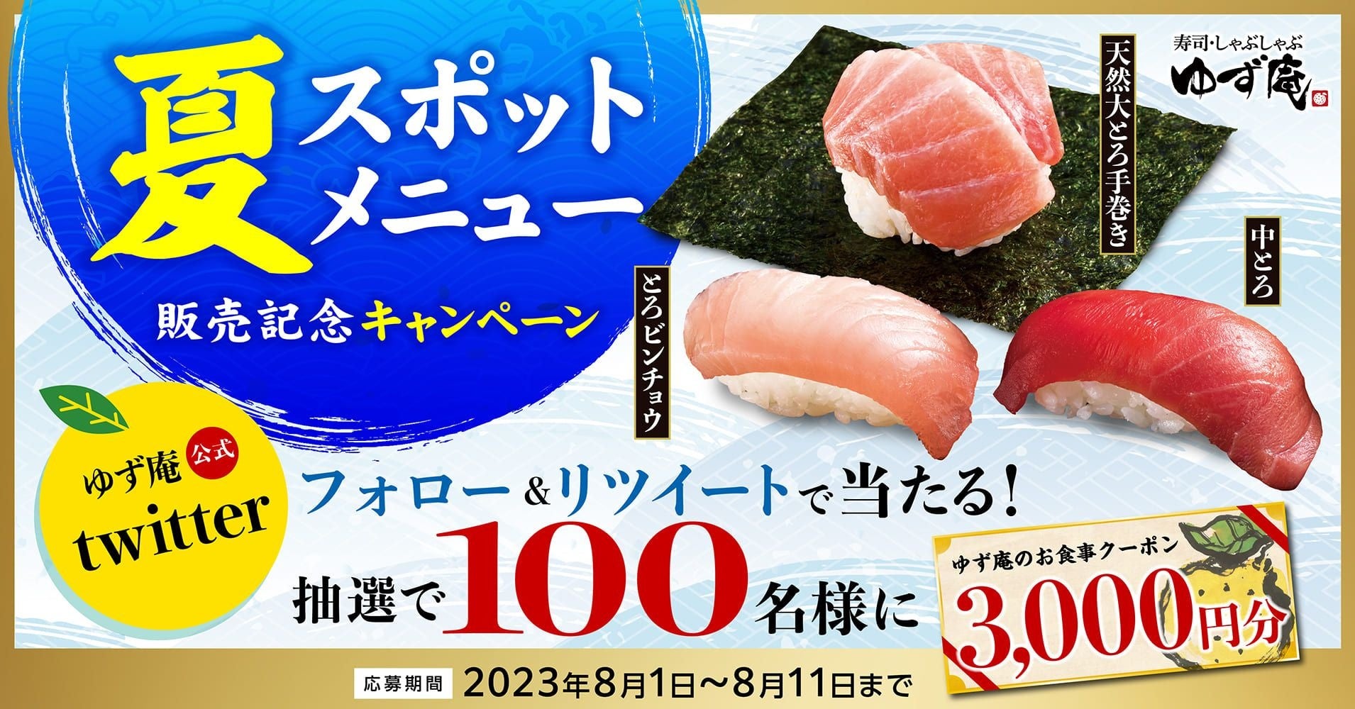 株式会社物語コーポレーション(本社:愛知県豊橋市/代表取締役社長:加藤 央之)が全国94店舗展開する『寿司・しゃぶしゃぶ ゆず庵』(以下、ゆず庵)は、夏スポットメニュー「鮪とろ三昧」の販売を記念して、本日より公式Twitterにてゆず庵のお食事券3,000円分が当たるプレゼントキャンペーンを開催いたします。