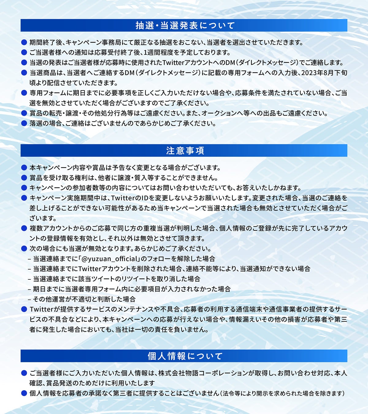 厳正な抽選のうえ、当選者を決定いたします。当選者には本キャンペーン期間終了後、1週間ほどでTwitterのダイレクトメッセージにて当選の旨と送付先ご入力フォームをご案内いたします。