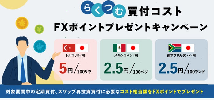 対象期間中の定期買付、スワップ再投資買付に必要なコスト相当額をFXポイントでプレゼント
