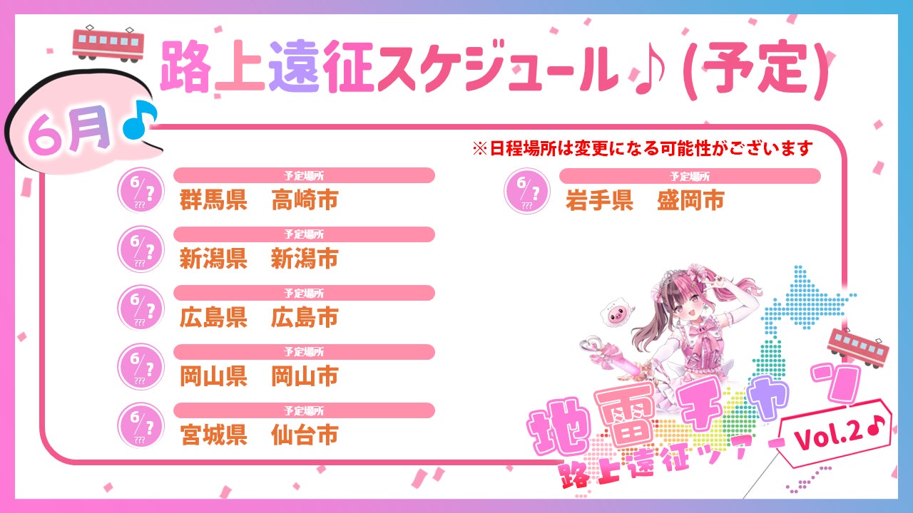 2025年1月~2月に実施した路上遠征ツアーの第2弾が、さらにボリュームアップして戻ってきます。前回未訪問だった中国地方(広島県・岡山県)や東北地方(宮城県・岩手県)を含む、全国12都市を巡る遠征ツアーを予定。詳細は地雷チャンのSNSにて随時発表いたします。