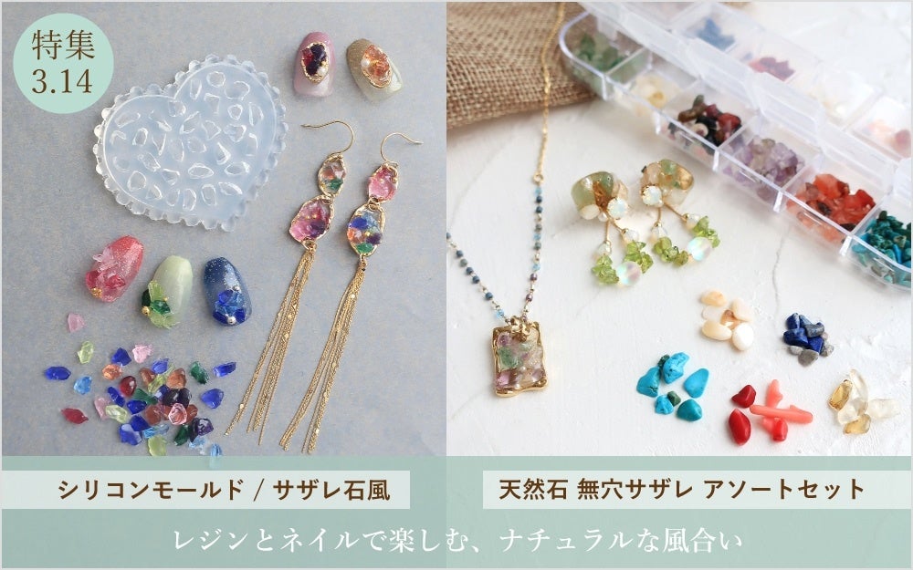 また、好きな色で不揃いサザレパーツが作れるレジンモールドも仲間入り。カラフルなサザレアクセサリーを身に付けてこれからの軽やかな季節を迎えましょう。