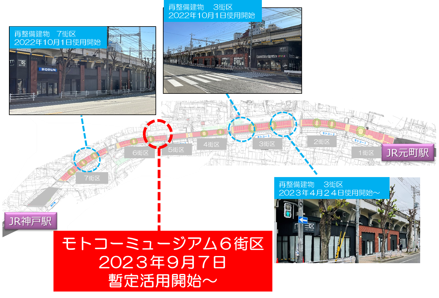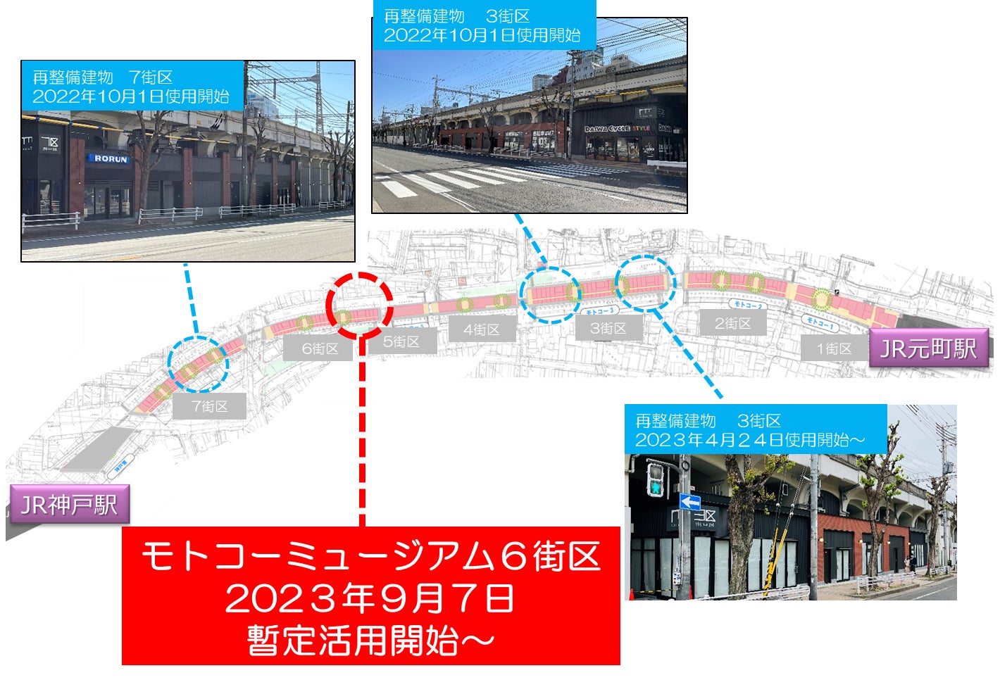 この度、弊社が2023年4月に定めました「JR西日本グループ長期ビジョン2032」における4つのビジョンの1つである「人々が行きかう、いきいきとしたまち」の実現に向けた取り組みの一環としまして、既存の再整備建物に加え、これまで多種多様な価値を生み出してきたモトコーへの想いを込め、返還いただいた高架下にある物などをオマージュし、アート化すると共に、それらを立体的に展示した「モトコーミュージアム」を暫定的に開業する運びとなりましたので、お知らせいたします。