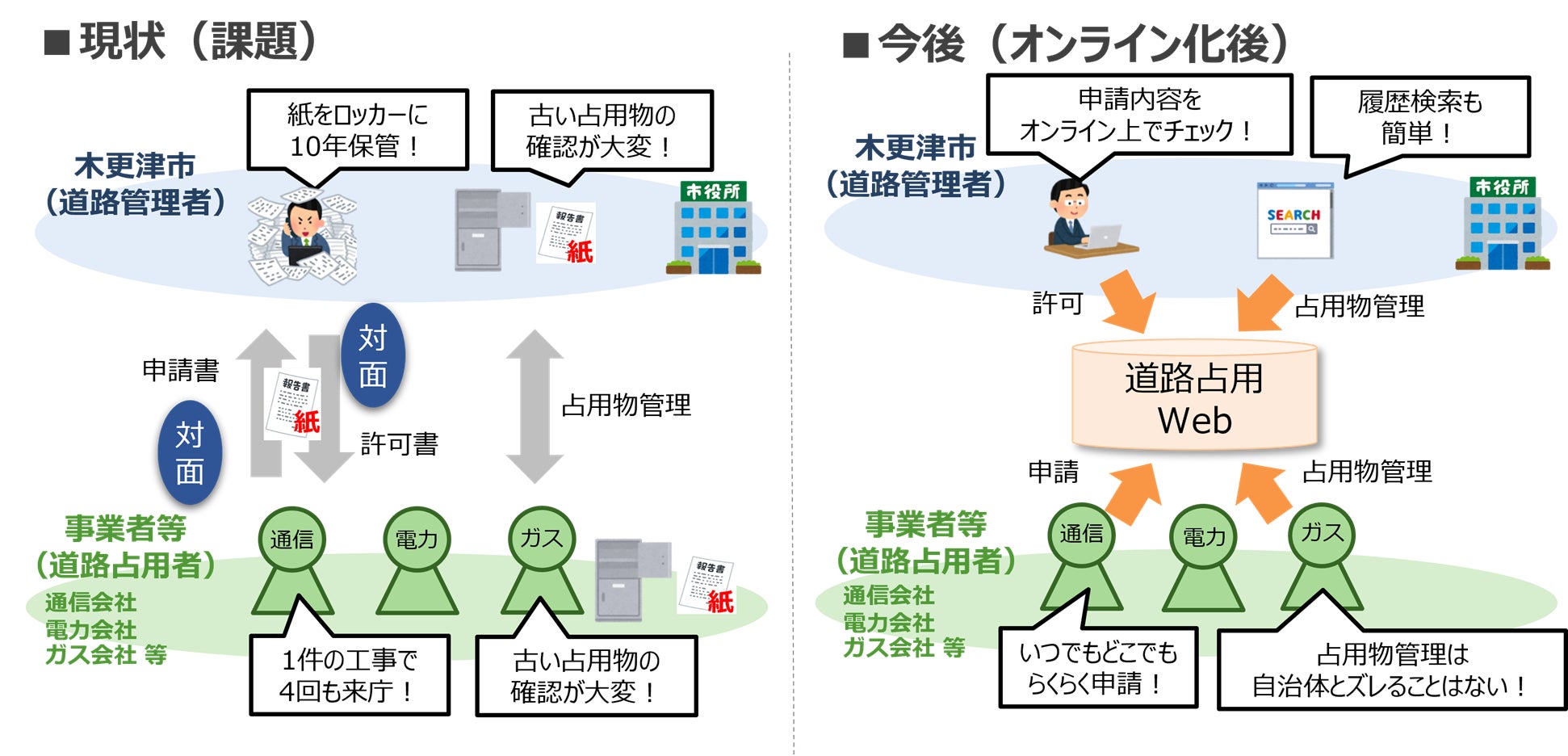 これにより、事業者などが公道やその上空及び地下などへ設備を設置し、継続して道路を使用する「道路占用」を行う際に必要となる行政機関への申請手続きについて業務効率化を図り、ユーザビリティー及び行政サービス向上、社会インフラの管理に関わるコスト削減などをめざします。