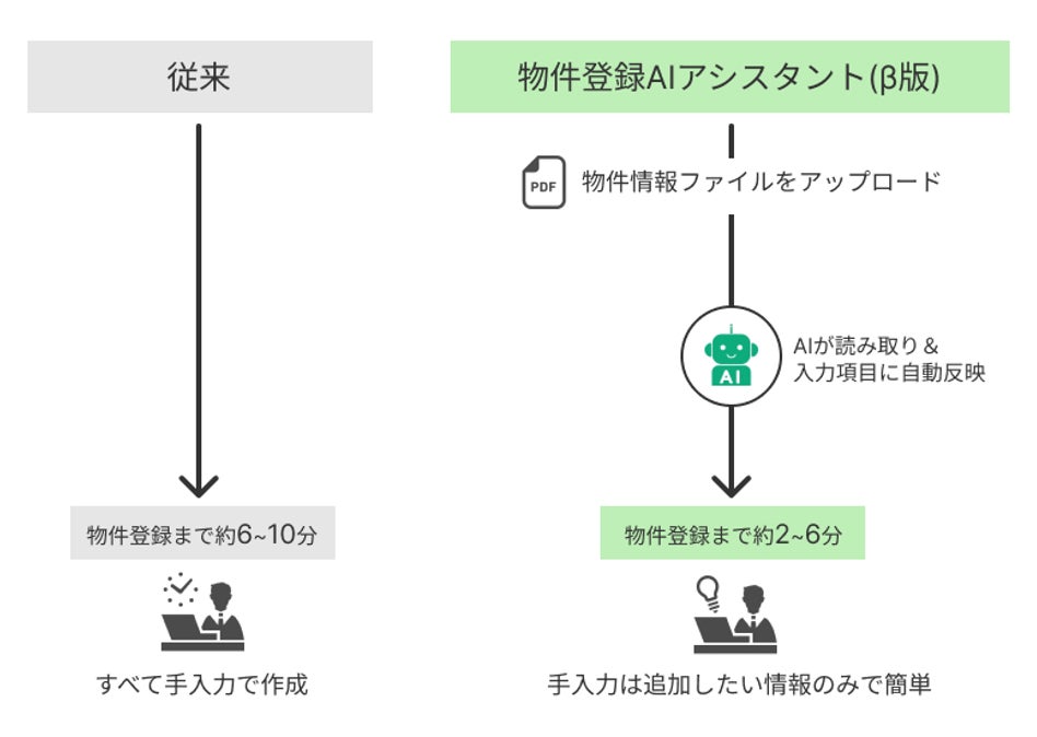 このような不動産会社の皆様の声を反映し、業務負担を少しでも軽減することはできないかと検討し、AIを活用した物件登録効率化を図る機能の開発に至りました。