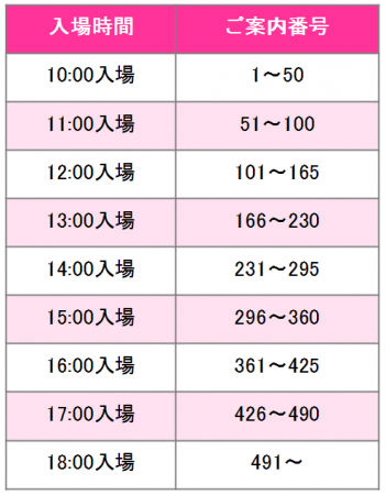 ※お連れ様と一緒に入場される場合は、後の番号に合わせての入場となります。予めご了承ください。