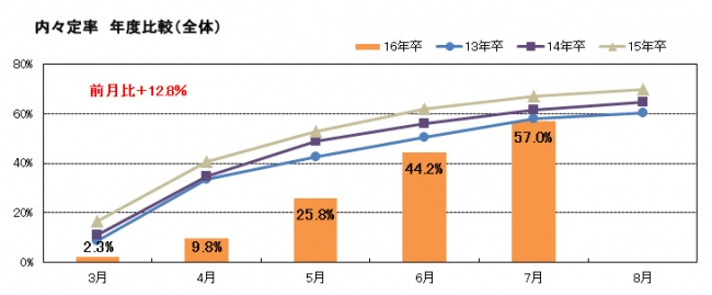 ■ 2016年卒業予定大学生、大学院生の7月の内々定率は全体で57.0%