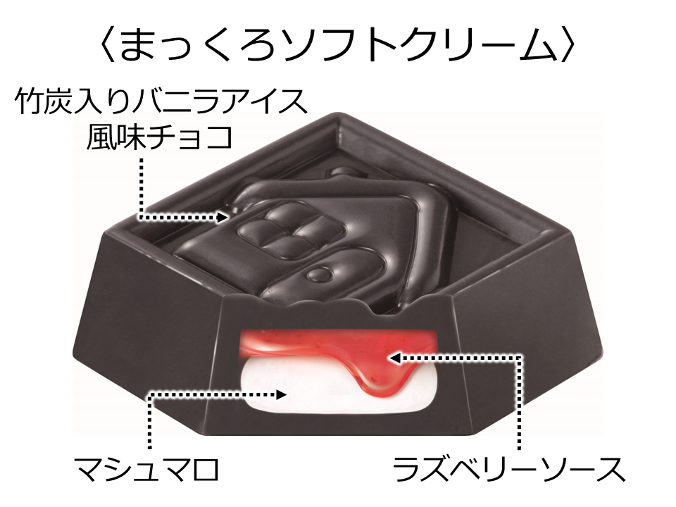 まっくろな竹炭入りバニラアイス風味チョコで、おばけをイメージした白いフワフワなマシュマロと真っ赤な口をイメージしたラズベリーソースを包み絵本の世界観を表現しています。