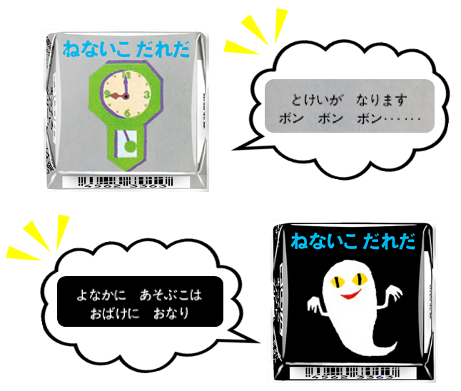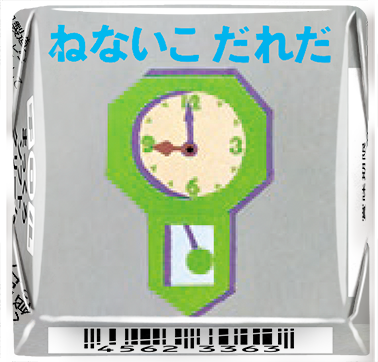 個包装には絵本のシーンがそのまま描かれており、裏には「とけいがなります ボン ボン ボン・・・・・・」などの文章入り。