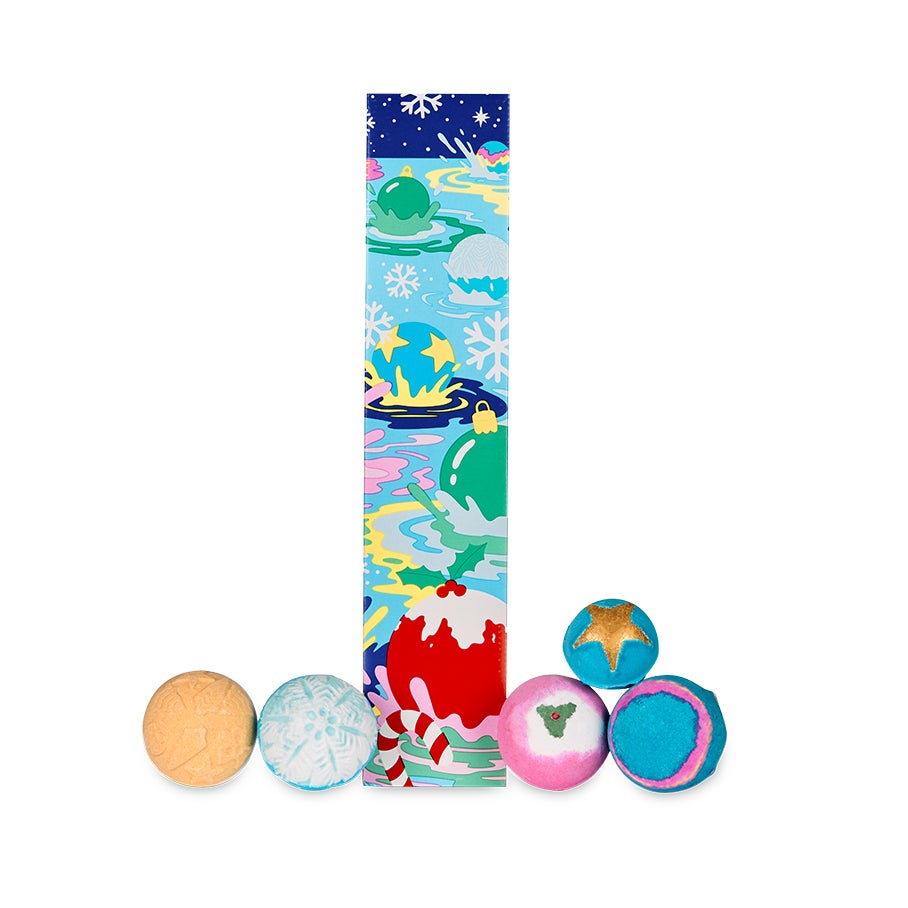 魅力的なバスボム5種が入ったギフト。サイケデリックなデザインのパッケージは、惑星からバスボムが降ってきて、お湯の中で溶け混ざりあう様子が表現されています。