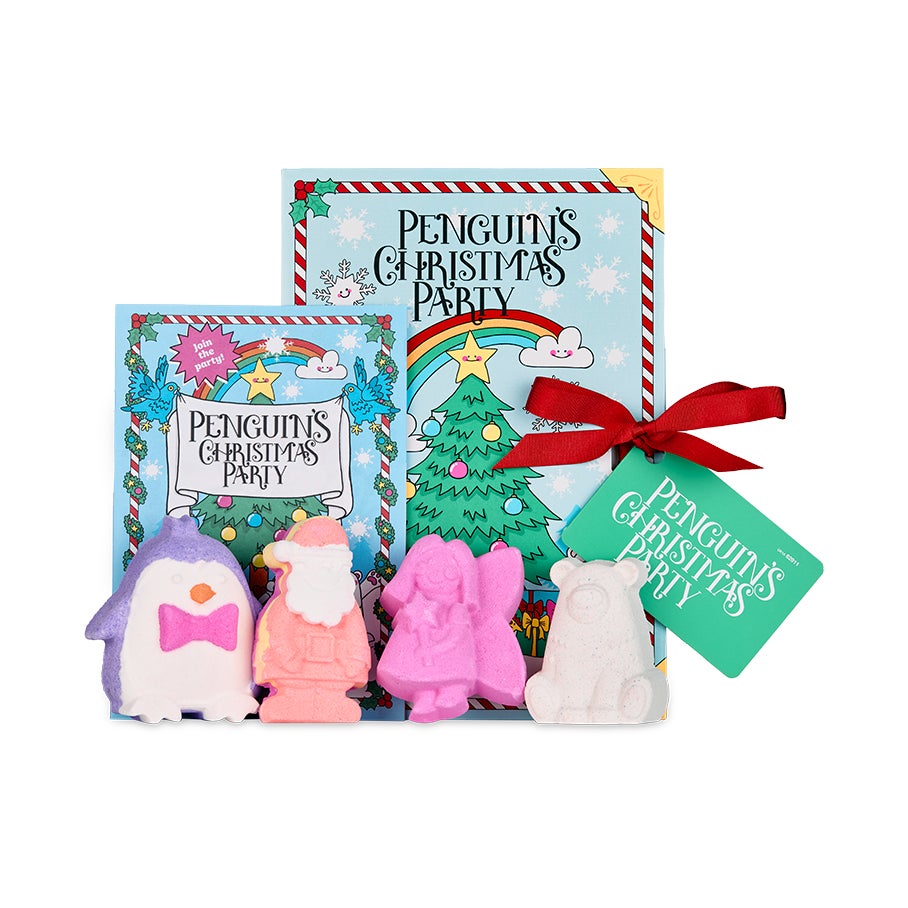 クリスマスツリーの下に飾るのにぴったりな本の形をしたボックスにクリスマスを盛り上げるサンタやペンギンのバスボム4種が入ったギフト。