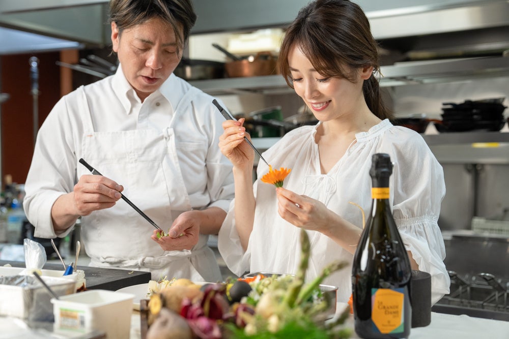 テイスティングを堪能したあとは、いよいよ、小林寛司シェフのお料理とのペアリングを体験。一足先に「ラ・グランダム 2015 ガーデンラウンジ」で提供されるメニューを味わった泉里香さんは、「見た目にも味わい的にも繊細で優しいホワイトアスパラのシグネチャーディッシュは、太陽の日差しをいっぱいに受けたというラ・グランダム 2015にぴったり合う美味しさでした。」とコメント。また、この特別な一日を振り返り、「実際に畑で収穫した野菜を調理することの楽しさ・豊かさを感じました。実際にシェフとともにキッチンに入って一緒に盛り付けをさせていただいて、すごくいい経験ができました。」と語りました。